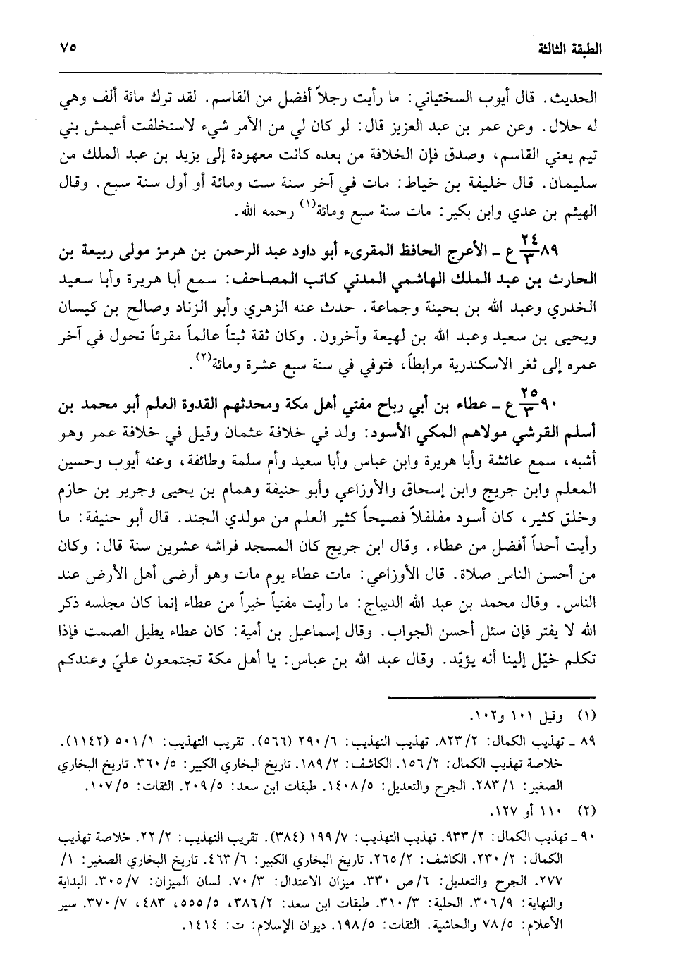 89- 24/ 3ع- الأعرج الحافظ المقرئ أبو داود عبد الرحمن بن هرمز مولى ربيعة بن الحارث بن عبد الملك الهاشمي المدني كاتب المصاحف: سمع أبا هريرة وأبا سعيد الخدري وعبد الله بن بحينة وجماعة حدث عنه الزهرى وأبو الزناد وصالح بن كيسان ويحيى بن سعيد وعبد الله بن لهيعة وآخرون وكان ثقة ثبتا عالما مقرئا تحول في آخر عمره إلى ثغر الإسكندرية مرابطا فتوفى في سنة سبع عشرة ومائة2.