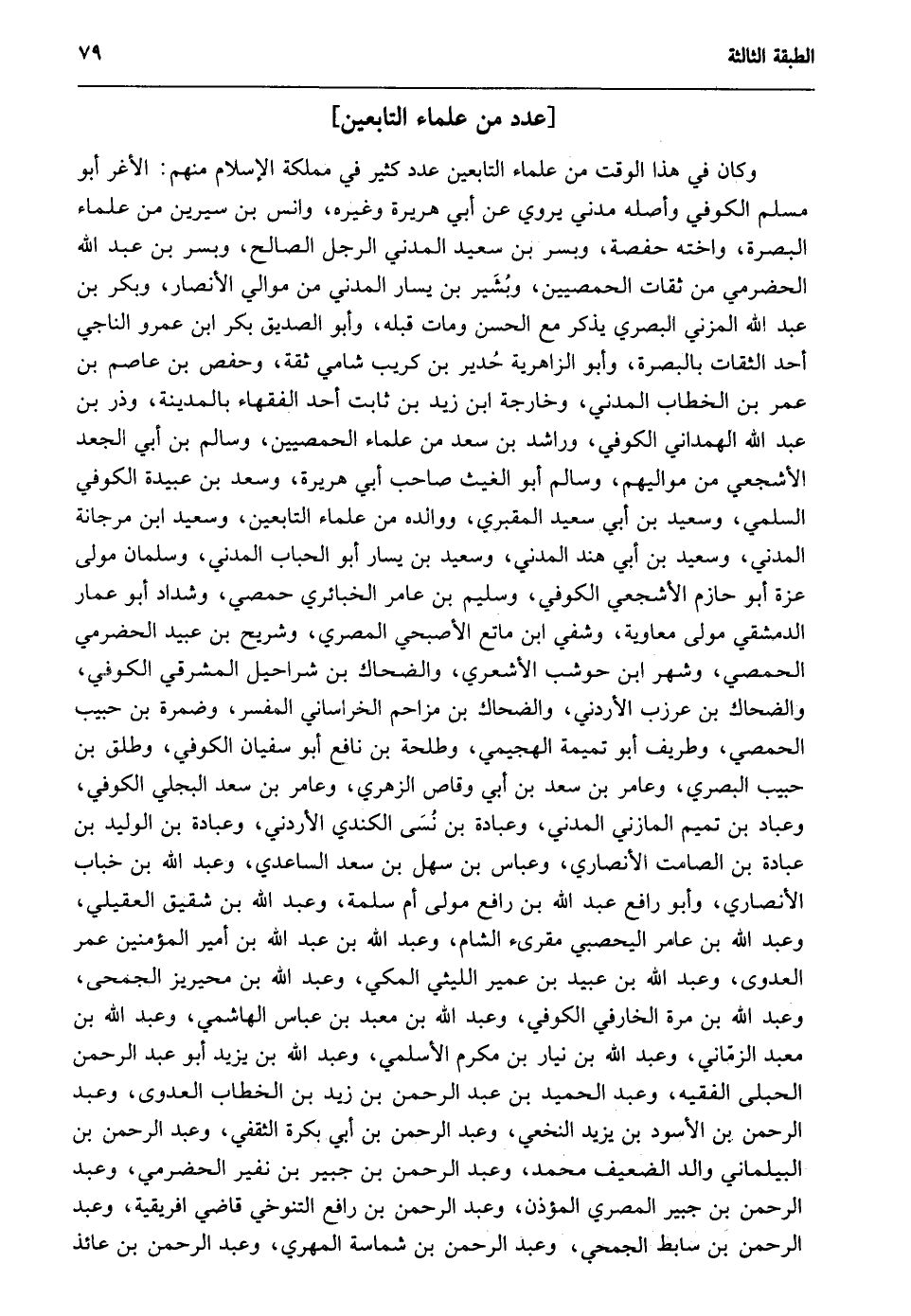 وكان في هذا الوقت من علماء التابعين عدد كثير في مملكة الإسلام منهم: الأغر أبو مسلم الكوفي وأصله مدني يروي عن أبي هريرة وغيره, وأنس بن سيرين من علماء البصرة, وأخته حفصة, وبسر بن سعيد المدني الرجل الصالح, وبسر بن عبد الله الحضرمي من ثقات الحمصيين, وبشير بن يسار المدني من موالي الأنصار, وبكر بن عبد الله المزني البصري يذكر مع الحسن ومات قبله, وأبو الصديق بكر بن عمرو الناجي أحد الثقات بالبصرة, وأبو الزاهرية حدير بن كريب شامي ثقة, وحفص بن عاصم بن عمر بن الخطاب المدني, وخارجة بن زيد بن ثابت أحد الفقهاء بالمدينة, وذر بن عبد الله الهمداني الكوفي, وراشد بن سعد من علماء الحمصيين, وسالم بن أبي الجعد الأشجعي من مواليهم وسالم أبو الغيث صاحب أبي هريرة, وسعد بن عبيدة الكوفي السلمي, وسعيد بن أبي سعيد المقبري ووالده من علماء التابعين, وسعيد بن مرجانة المدني, وسعيد بن أبي هند المدني, وسعيد بن يسار أبو الحباب المدني, وسلمان مولى عزة أبو حازم الأشجعي الكوفي, وسليم بن عامر الخبائري حمصي, وشداد أبو عمار الدمشقي مولى معاوية, وشفي بن ماتع الأصبحي المصري, وشريح بن عبيد الحضرمي الحمصي, وشهر بن حوشب الأشعري, والضحاك بن شراحيل المشرقي الكوفي, والضحاك بن عرزب الأردني والضحاك بن مزاحم الخراساني المفسر, وضمرة بن حبيب الحمصي, وطريف أبو تميمة الهجيمي, وطلحة بن نافع أبو سفيان الكوفي, وطلق بن حبيب البصري, وعامر بن سعد بن أبي وقاص الزهري, وعامر بن سعد البجلي الكوفي, وعباد بن تميم المازني المدني, وعبادة بن نسي الكندي الأردني, وعبادة بن الوليد بن عبادة بن الصامت الأنصاري, وعباس بن سهل بن سعد الساعدي, وعبد الله بن خباب الأنصاري, وأبو رافع عبد الله بن رافع مولى أم سلمة, وعبد الله بن شقيق العقيلي, وعبد الله بن عامر اليحصبي مقرئ الشام, وعبد الله بن عبد الله بن أمير المؤمنين عمر العدوي, وعبد الله بن عبيد بن عمير الليثي المكي, وعبد الله بن محيريز الجمحي, وعبد الله بن مرة الخارفي الكوفي, وعبد الله بن معبد بن عباس الهاشمي, وعبد الله بن معبد الزماني, وعبد الله بن نيار بن مكرم الأسلمي, وعبد الله بن يزيد أبو عبد الرحمن الحبلي الفقيه, وعبد الحميد بن عبد الرحمن بن يد بن الخطاب العدوي, وعبد الرحمن بن الأسود بن يزيد النخعي, وعبد الرحمن بن أبي بكرة الثقفي, وعبد الرحمن بن البيلماني والد الضعيف محمد, وعبد الرحمن بن جبير بن نفير الحضرمي, وعبد الرحمن بن جبير المصري المؤذن, وعبد الرحمن بن رافع التنوخي قاضي إفريقية, وعبد الرحمن بن سابط الجمحي وعبد الرحمن بن شماسة المهري, وعبد الرحمن بن عائذ