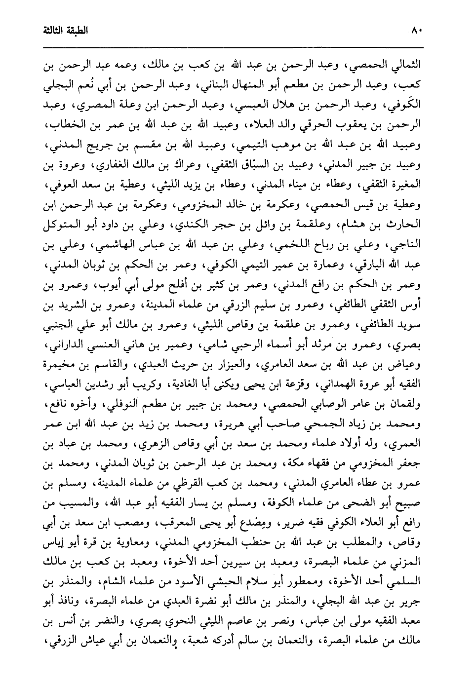 الثمالي الحمصي, وعبد الرحمن بن عبد الله بن كعب بن مالك, وعمه عبد الرحمن بن كعب, وعبد الرحمن بن مطعم أبو المنهال البناني, وعبد الرحمن بن أبي نعم البجلي الكوفي, وعبد الرحمن بن هلال العبسي, وعبد الرحمن بن, وعلة المصري, وعبد الرحمن بن يعقوب الحرقي والد العلاء, وعبيد الله بن عبد الله بن عمر بن الخطاب, وعبيد الله بن عبد الله بن موهب التيمي, وعبيد الله بن مقسم بن جريج المدني, وعبيد بن جبير المدني, وعبيد بن السباق الثقفي, وعراك بن مالك الغفاري, وعروة بن المغيرة الثقفي, وعطاء بن ميناء المدني, وعطاء بن يزيد الليثي, وعطية بن سعد العوفي, وعطية بن قيس الحمصي, وعكرمة بن خالد المخزومي, وعكرمة بن عبد الرحمن بن الحارث بن هشام, وعلقمة بن وائل بن حجر الكندي, وعلي بن داود أبو المتوكل الناجي, وعلي بن رباح اللخمي, وعلي بن عبد الله بن عباس الهاشمي, وعلي بن عبد الله البارقي, وعمارة بن عمير التيمي الكوفي, وعمر بن الحكم بن ثوبان المدني, وعمر بن الحكم بن رافع المدني, وعمر بن كثير بن أفلح مولى أبي أيوب, وعمرو بن أوس الثقفي الطائفي, وعمرو بن سليم الزرقي من علماء المدينة, وعمرو بن الشريد بن سويد الطائفي, وعمرو بن علقمة بن وقاص الليثي, وعمرو بن مالك أبو علي الجنبي بصري, وعمرو بن مرثد أبو أسماء الرحبي شامي, وعمير بن هاني العنسي الداراني, وعياض بن عبد الله بن سعد العامري, والعيزار بن حريث العبدي, والقاسم بن مخيمرة الفقيه أبو عروة الهمداني, وقزعة بن يحيى ويكنى أبا الغادية, وكريب أبو رشدين العباسي, ولقمان بن عامر الوصابي الحمصي, ومحمد بن جبير بن مطعم النوفلي, وأخوه نافع, ومحمد بن زياد الجمحي صاحب أبي هريرة, ومحمد بن زيد بن عبد الله بن عمر العمري وله أولاد علماء, ومحمد بن سعد بن أبي وقاص الزهري, ومحمد بن عباد بن جعفر المخزومي من فقهاء مكة, ومحمد بن عبد الرحمن بن ثوبان المدني, ومحمد بن عمرو بن عطاء العامري المدني, ومحمد بن كعب القرظي من علماء المدينة, ومسلم بن صبيح أبو الضحى من علماء الكوفة, ومسلم بن يسار الفقيه أبو عبد الله, والمسيب بن رافع أبو العلاء الكوفي فقيه ضرير, ومصدع أبو يحيى المعرقب ومصعب بن سعد بن أبي وقاص, والمطلب بن عبد الله بن حنطب المخزومي المدني, ومعاوية بن قرة أبو إياس المزني من علماء البصرة, ومعبد بن سيرين أحد الأخوة, ومعبد بن كعب بن مالك السلمي أحد الأخوة, وممطور أبو سلام الحبشي الأسود من علماء الشام, والمنذر بن جرير بن عبد الله البجلي, والمنذر بن مالك أبو نضرة العبدي من علماء البصرة. ونافذ أبو معبد الفقيه مولى بن عباس ونصر بن عاصم الليثي النحوي بصري, والنضر بن أنس بن مالك من علماء البصرة والنعمان بن سالم أدركه شعبة, والنعمان بن أبي عياش الزرقي,