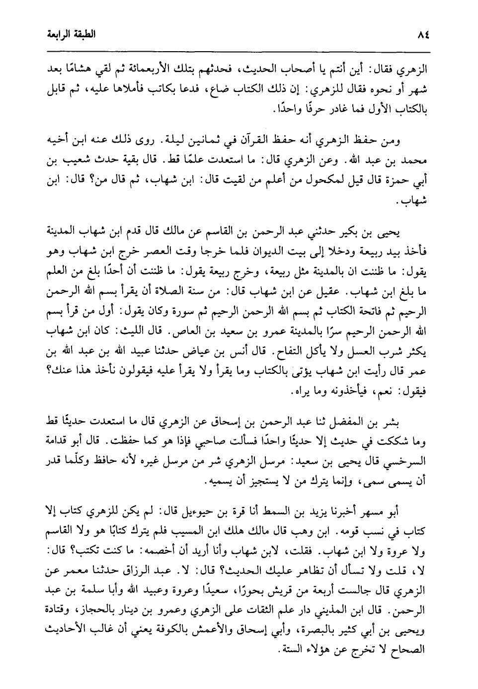 أبو مسهر أخبرنا يزيد بن السمط أنا قرة بن حيوءيل قال: لم يكن للزهري كتاب إلا كتاب في نسب قومه. ابن وهب قال: مالك هلك ابن المسيب فلم يترك كتابا هو ولا القاسم ولا عروة ولا ابن شهاب. فقلت, لابن شهاب وأنا أريد أن أخصمه: ما كنت تكتب؟ قال: لا قلت ولا تسأل أن تظاهر عليك الحديث؟ قال: لا عبد الرزاق حدثنا معمر عن الزهري قال جالست أربعة من قريش بحورا سعيدا وعروة وعبيد الله وأبا سلمة بن عبد الرحمن، قال ابن المديني: دار علم الثقات علي الزهري وعمرو بن دينار بالحجاز وقتادة ويحيى بن أبي كثير بالبصرة وأبي إسحاق والأعمش بالكوفة يعني أن غالب الأحاديث الصحاح لا تخرج عن هؤلاء الستة.