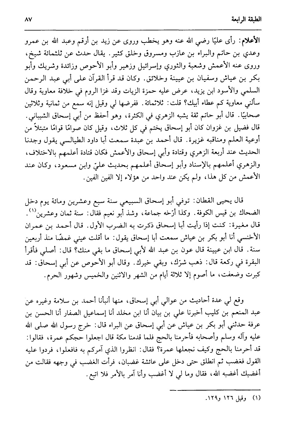 قال يحيى القطان: توفي أبو إسحاق السبيعي سنة سبع وعشرين ومائة يوم دخل الضحاك بن قيس الكوفة. وكذا أرخه جماعة, وشذ أبو نعيم فقال: سنة ثمان وعشرين1. قال مغيرة: كنت إذا رأيت أبا إسحاق ذكرت به الضرب الأول. قال أحمد بن عمران الأخنسي أنا أبو بكر بن عياش سمعت أبا إسحاق يقول: ما أقلت عيني غمضا منذ أربعين سنة. قال بن عيينة قال عون بن عبد الله لأبي إسحاق ما بقي منك قال: أصلي فأقرأ البقرة في ركعة قال: ذهب شرك, وبقي خيرك. وقال أبو الأحوص عن أبي إسحاق: قد كبرت وضعفت، ما أصوم إلا ثلاثة أيام من الشهر والإثنين والخميس وشهور الحرم.
