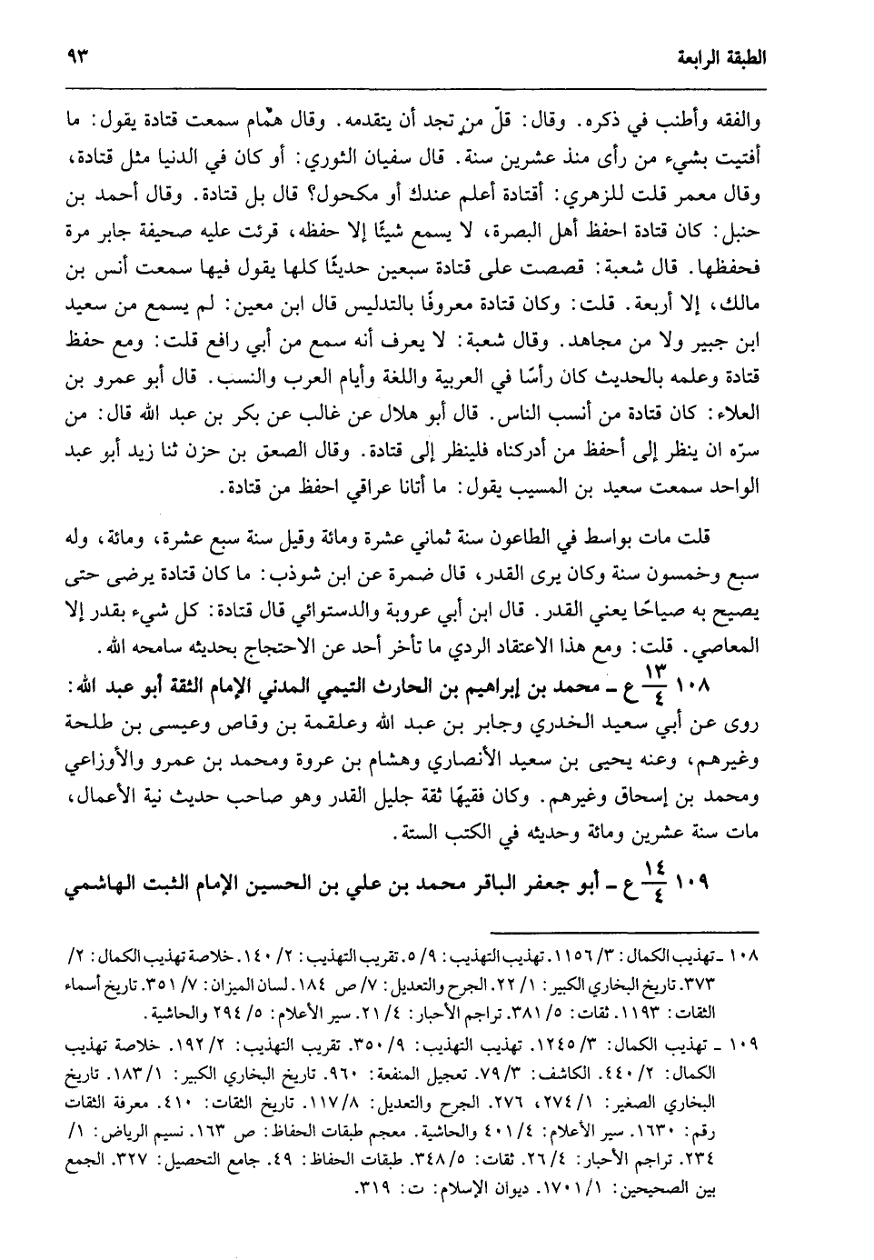 108- 13/ 4ع- محمد بن إبراهيم بن الحارث التيمي المدني الإمام الثقة أبو عبد الله: روى عن أبي سعيد الخدري وجابر بن عبد الله وعلقمة بن وقاص وعيسى بن طلحة وغيرهم وعنه يحيى بن سعيد الأنصاري وهشام بن عروة ومحمد بن عمرو والأوزاعي ومحمد بن إسحاق وغيرهم وكان فقيها ثقة جليل القدر وهو صاحب حديث نية الأعمال مات سنة عشرين ومات وحديثه في الكتب الستة.