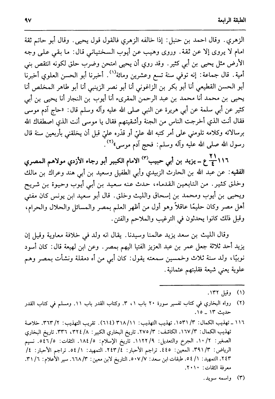 116- 21/ 4ع- يزيد بن أبي حبيب الإمام الكبير أبو رجاء الأزدي مولاهم المصري الفقيه: عن عبد الله بن الحارث الزبيدي وأبي الطفيل وسعيد بن أبي هند وعراك بن مالك وخلق كثير من التابعين القدماء حدث عنه سعيد بن أبي أيوب وحيوة بن شريح ويحيى بن أيوب ومحمد بن إسحاق والليث وخلق. قال أبو سعيد بن يونس كان مفتي أهل مصر وكان حليما عاقلا وهو أول من أظهر العلم بمصر والمسائل والحلال والحرام وقبل ذلك كانوا يحدثون في الترغيب والملاحم والفتن.