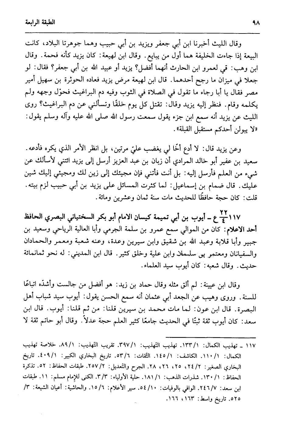 117- 22/ 4 ع- أيوب بن أبي تميمة كيسان الإمام أبو بكر السختياني البصري الحافظ أحد الأعلام: كان من الموالي سمع عمرو بن سلمة الجرمي وأبا العالية الرياحي وسعيد بن جبير وأبا قلابة وعبد الله بن شقيق وابن سيرين وعدة وعنه شعبة ومعمر والحمادان والسفيانان ومعتمر بن سليمان وابن علية وخلق كثير. قال ابن المديني: له نحو ثمانمائة حديث. وقال شعبة: كان أيوب سيد العلماء.
