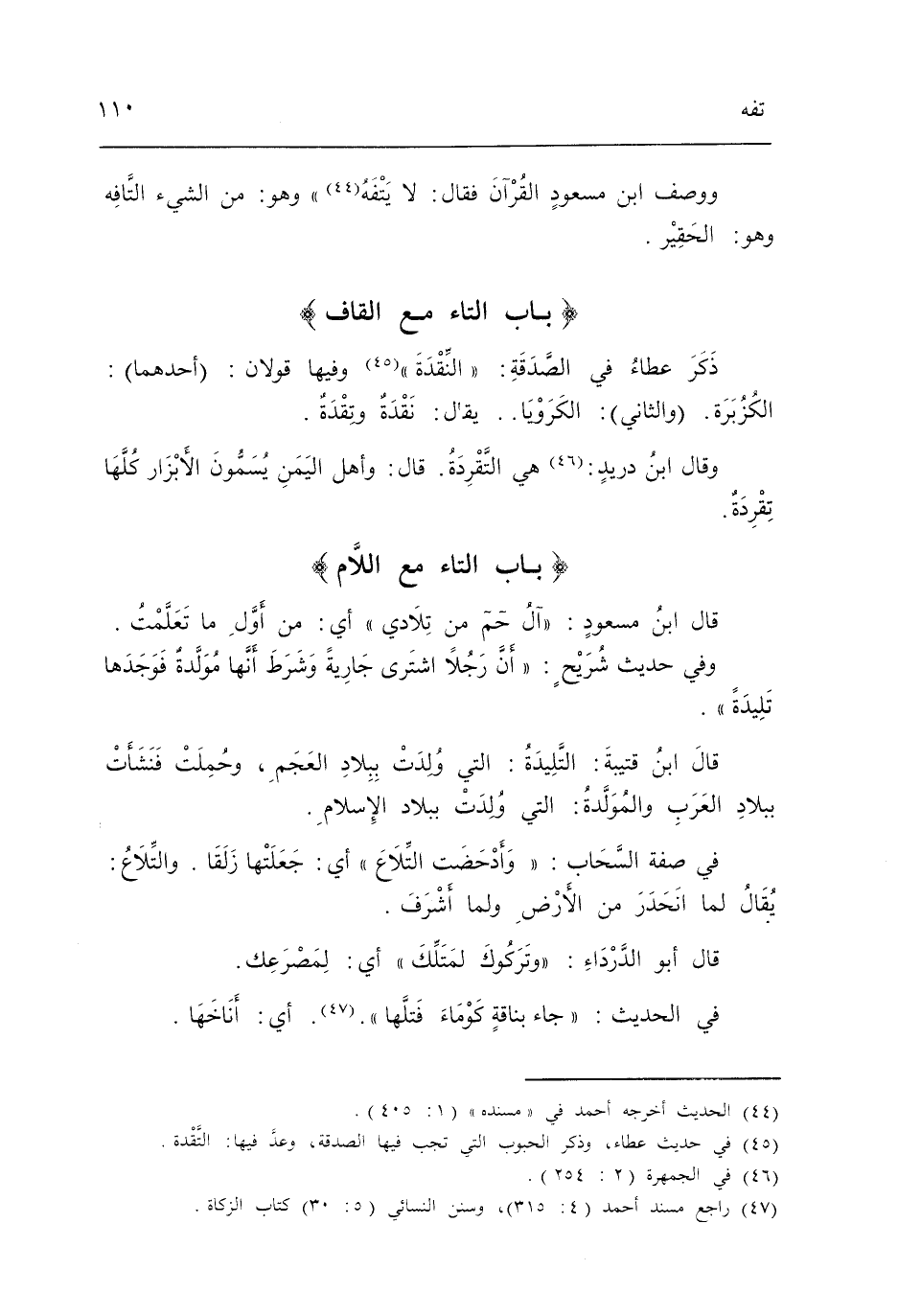 وَوصف ابْن مَسْعُود الْقُرْآن فَقَالَ لَا يتفه وَهُوَ من الشَّيْء التافه وَهُوَ الحقير.