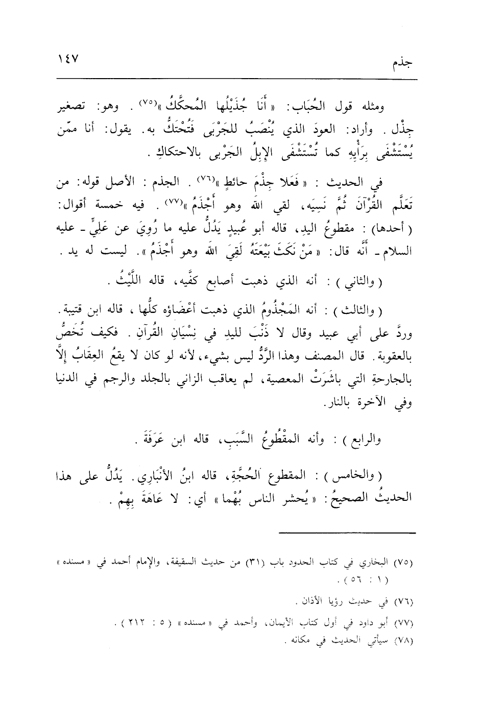 وَالْخَامِس الْمَقْطُوع الْحجَّة قَالَ ابْن الْأَنْبَارِي يدل عَلَى هَذَا الحَدِيث الصَّحِيح يحْشر النَّاس بهما أَي لَا عاهة بهم