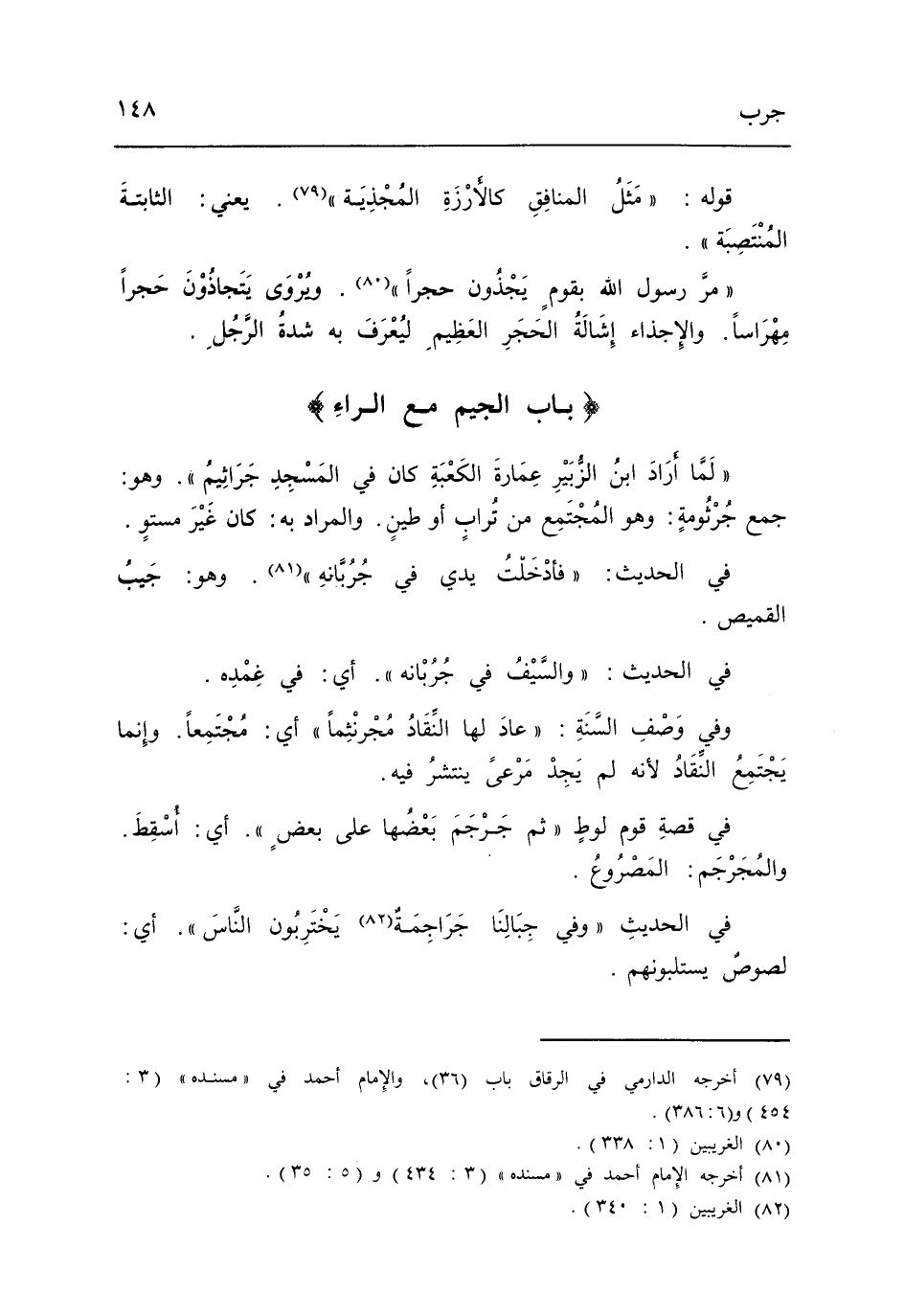 لما أَرَادَ ابْن الزبير عمَارَة الْكَعْبَة كَانَ فِي الْمَسْجِد جراثيم وَهُوَ جمع جرثومة وَهُوَ الْمُجْتَمع من تُرَاب أَو طين وَالْمرَاد بِهِ كَانَ غير مستو.