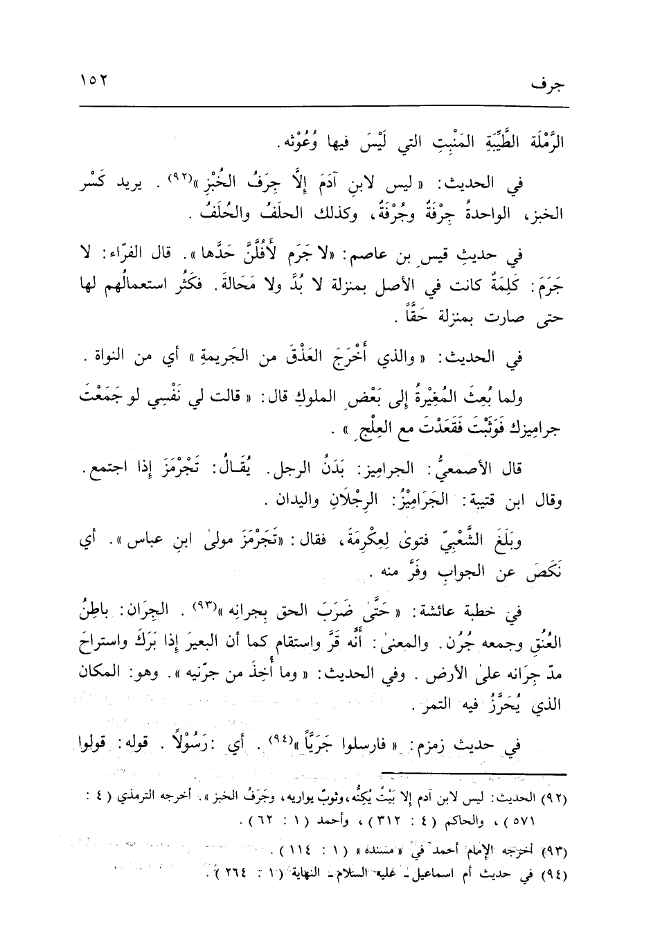 فِي خطْبَة عَائِشَة حَتَّى ضرب الْحق بجرانه الجران بَاطِن الْعُنُق وَجمعه جرن وَالْمعْنَى أَنه قر واستقام كَمَا أَن الْبَعِير إِذا برك واستراح مد جرانه عَلَى الأَرْض وَفِي الحَدِيث وَمَا أَخذ من جرنيه وَهُوَ الْمَكَان الَّذِي يحرز فِيهِ التَّمْر.
