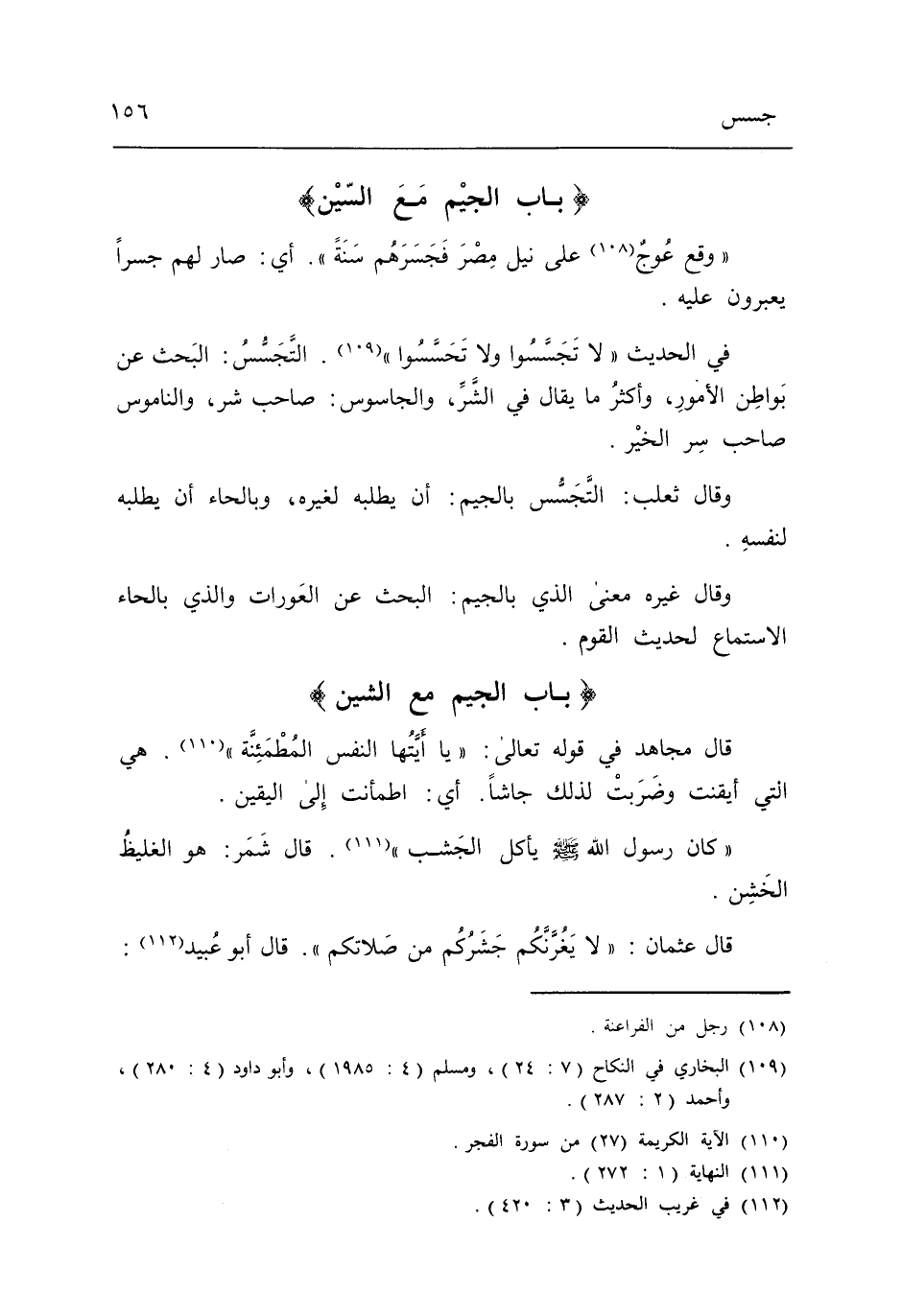 وَقَالَ ثَعْلَب التَّجَسُّس بِالْجِيم أَن يَطْلُبهُ لغيره وَبِالْحَاءِ أَن يَطْلُبهُ لنَفسِهِ.