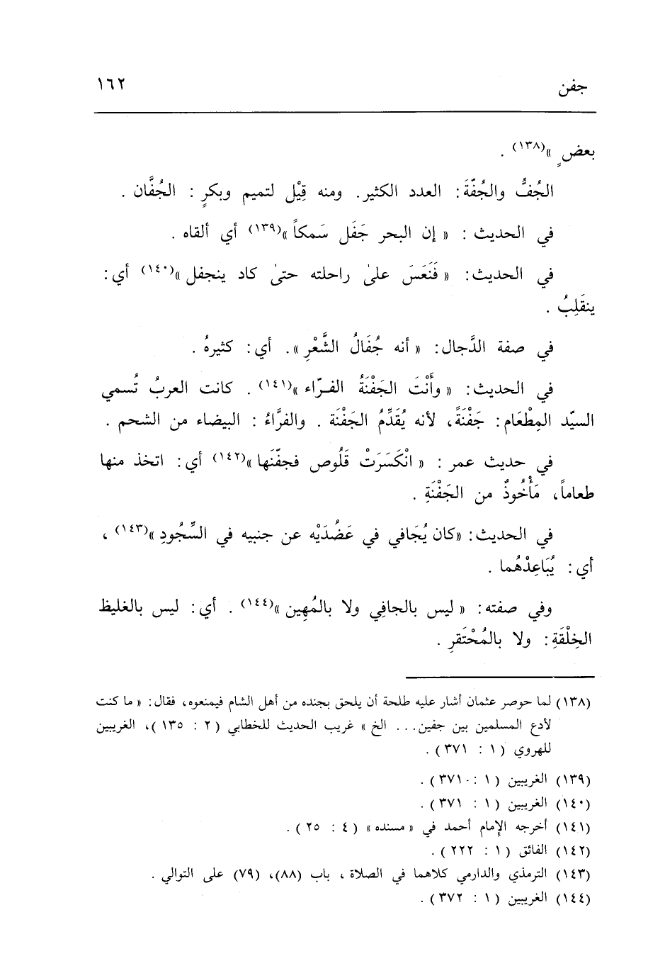 فِي الحَدِيث وَأَنت الْجَفْنَة الْفراء كَانَت الْعَرَب تسمي السَّيِّد المطعام جَفْنَة لِأَنَّهُ يقدم الْجَفْنَة وَالْفراء الْبَيْضَاء من الشَّحْم.