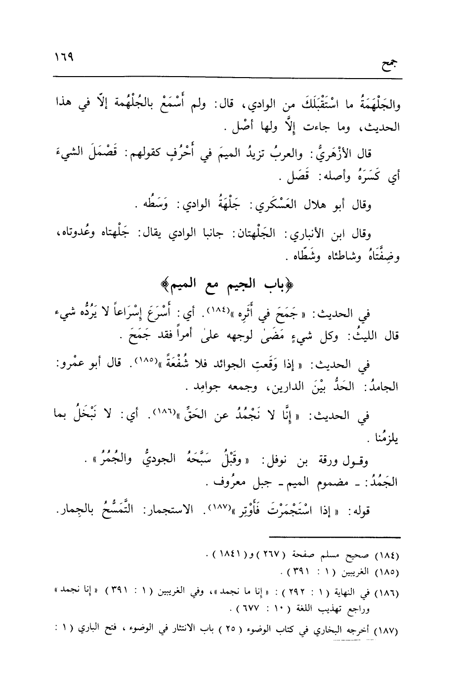 والجلهمة مَا استقبلك من الْوَادي قَالَ وَلم أسمع بالجلهمة إِلَّا فِي هَذَا الحَدِيث وَمَا جَاءَت إِلَّا وَلها أصل.