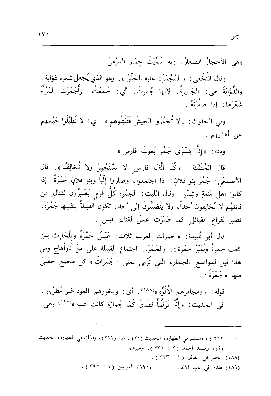 قَالَ الحطيئة كُنَّا ألف فَارس لَا نستجمر وَلَا نخالف قَالَ الْأَصْمَعِي جمر بَنو فلَان إِذا اجْتَمعُوا وصاروا إلبا وَبَنُو فلَان جَمْرَة إِذا كَانُوا أهل مَنْعَة وَشدَّة وَقَالَ اللَّيْث الْجَمْرَة كل قوم يصبرون لقِتَال من قَاتلهم لَا يخالفون أحدا وَلَا ينضمون إِلَى أحد تكون الْقَبِيلَة بِنَفسِهَا جَمْرَة تصبر لقراع الْقَبَائِل كَمَا صبرت عبس لقِتَال قيس.