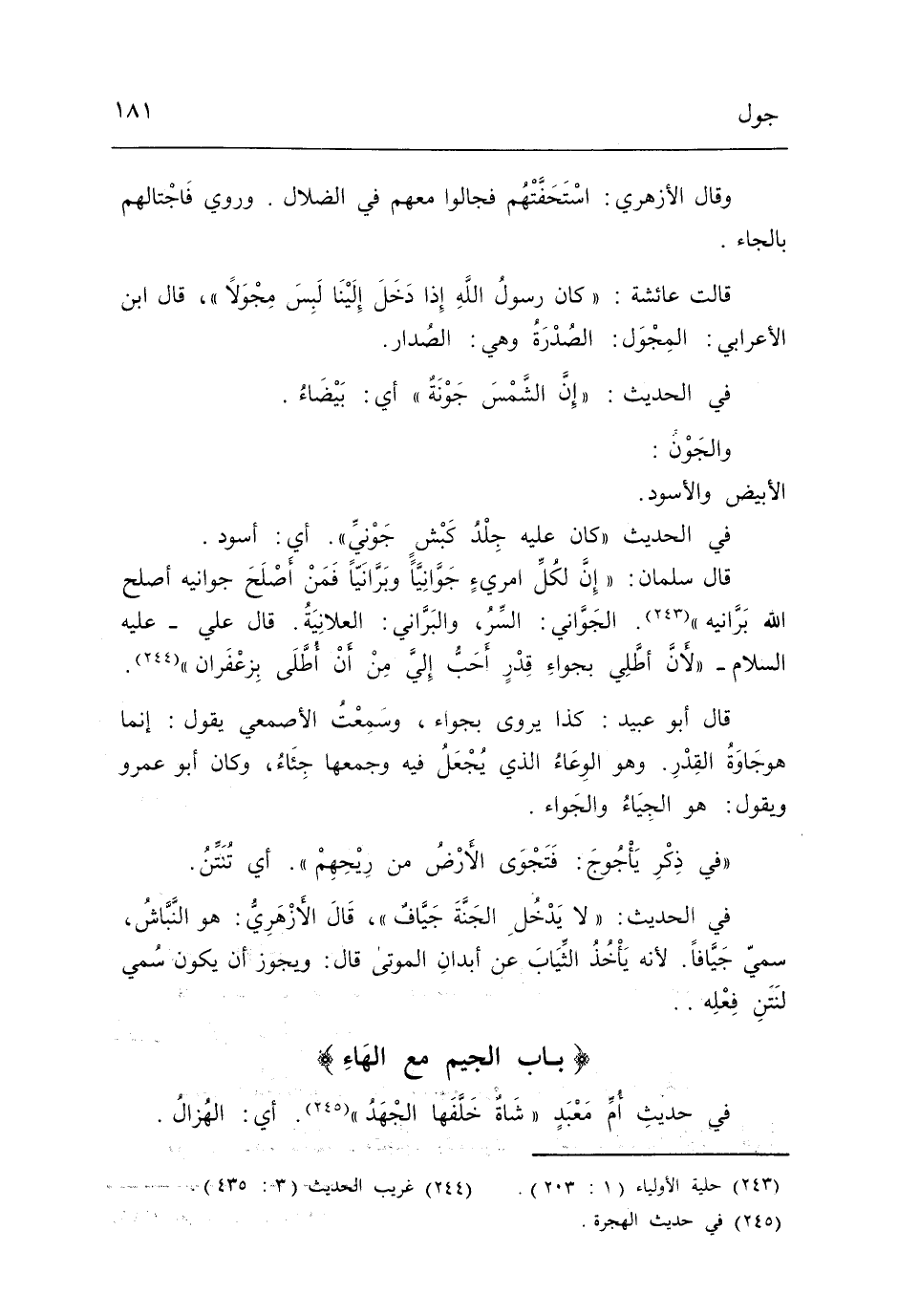 قَالَ أَبُو عبيد كَذَا يرْوَى بجواء وَسمعت الْأَصْمَعِي يَقُول إِنَّمَا هوجاوة الْقدر وَهُوَ الْوِعَاء الَّذِي يَجْعَل فِيهِ وَجَمعهَا جئاء وَكَانَ أَبُو عَمْرو وَيَقُول هُوَ الجياء والجواء.