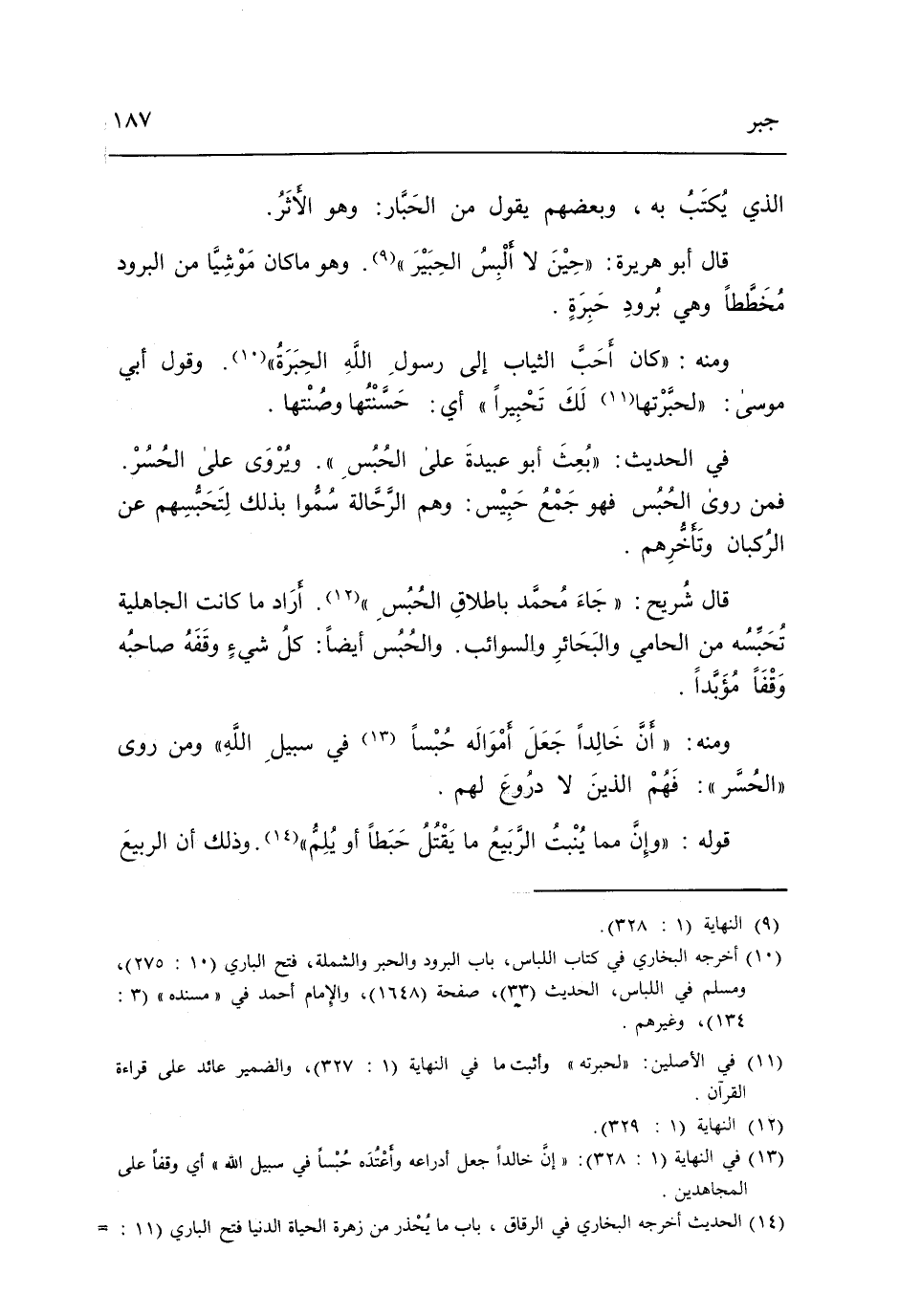 وَمِنْه كَانَ أحب الثِّيَاب إِلَى رَسُول الله الْحبرَة وَقَول أبي مُوسَى لحبرتها لَك تحبيرا أَي حسنتها وصنتها.