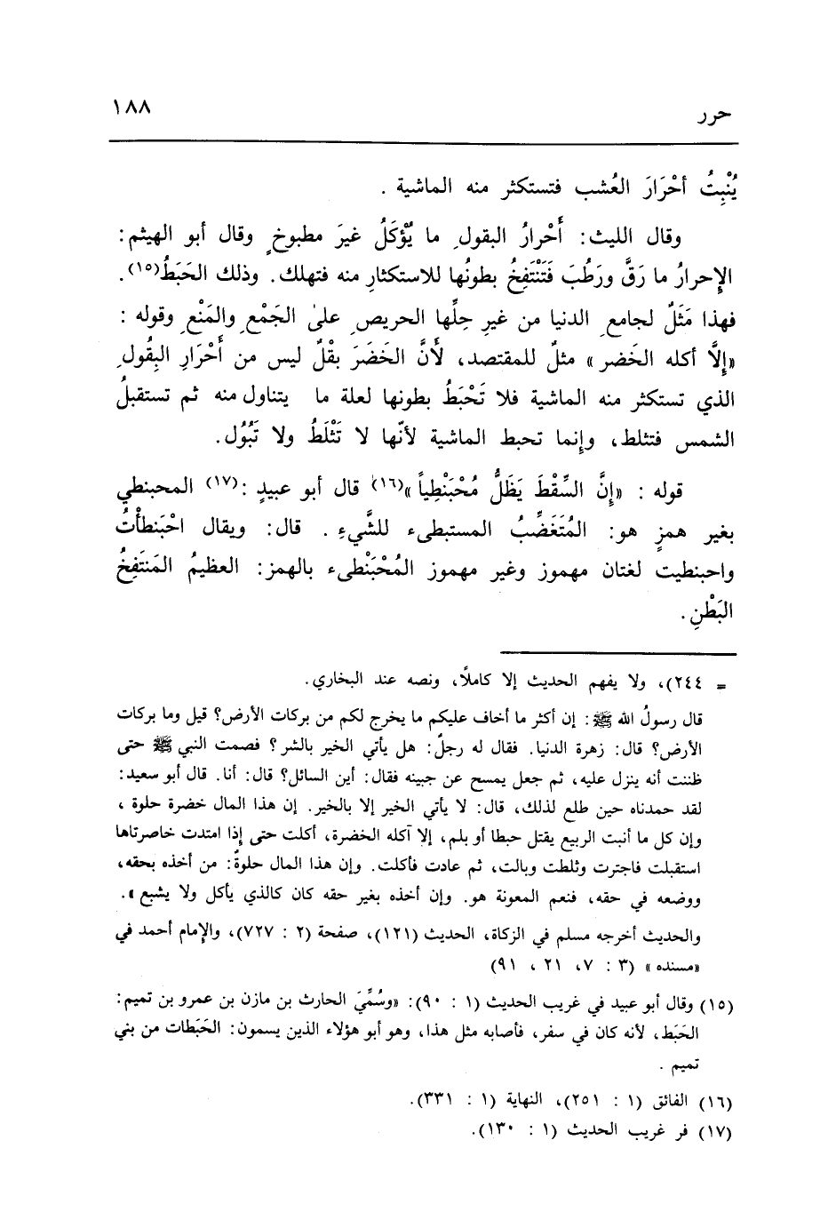 وَقَالَ اللَّيْث أَحْرَار الْبُقُول مَا يُؤْكَل غير مطبوخ وَقَالَ أَبُو الْهَيْثَم الْأَحْرَار مَا رق وَرطب فتنتفخ بطونها للاستكثار مِنْهُ فتهلك وَذَلِكَ الحبط. فَهَذَا مثل لجامع الدُّنْيَا من غير حلهَا الْحَرِيص عَلَى الْجمع وَالْمَنْع وَقَوله إِلَّا أكله الْخضر مثل للمقتصد لِأَن الْخضر بقل لَيْسَ من أَحْرَار الْبُقُول الَّذِي تستكثر مِنْهُ الْمَاشِيَة فَلَا تحبط بطونها لعِلَّة مَا يتَنَاوَل مِنْهُ ثمَّ تسْتَقْبل الشَّمْس فتثلط وَإِنَّمَا تحبط الْمَاشِيَة لِأَنَّهَا لَا تثلط وَلَا تبول.