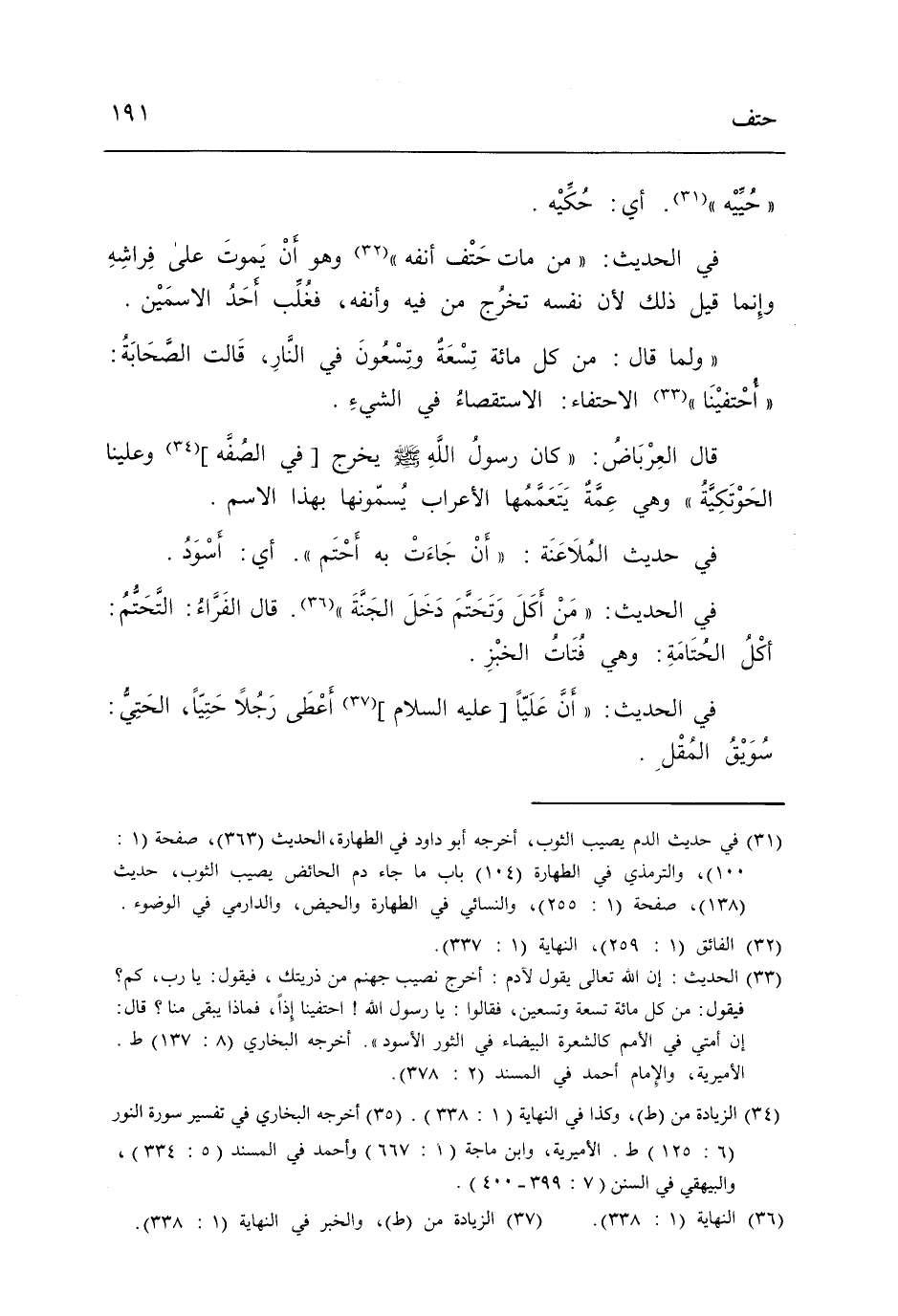 وَلما قَالَ من كل مائَة تِسْعَة وَتسْعُونَ فِي النَّار قَالَت الصَّحَابَة أحتفينا الاحتفاء الِاسْتِقْصَاء فِي الشَّيْء.
