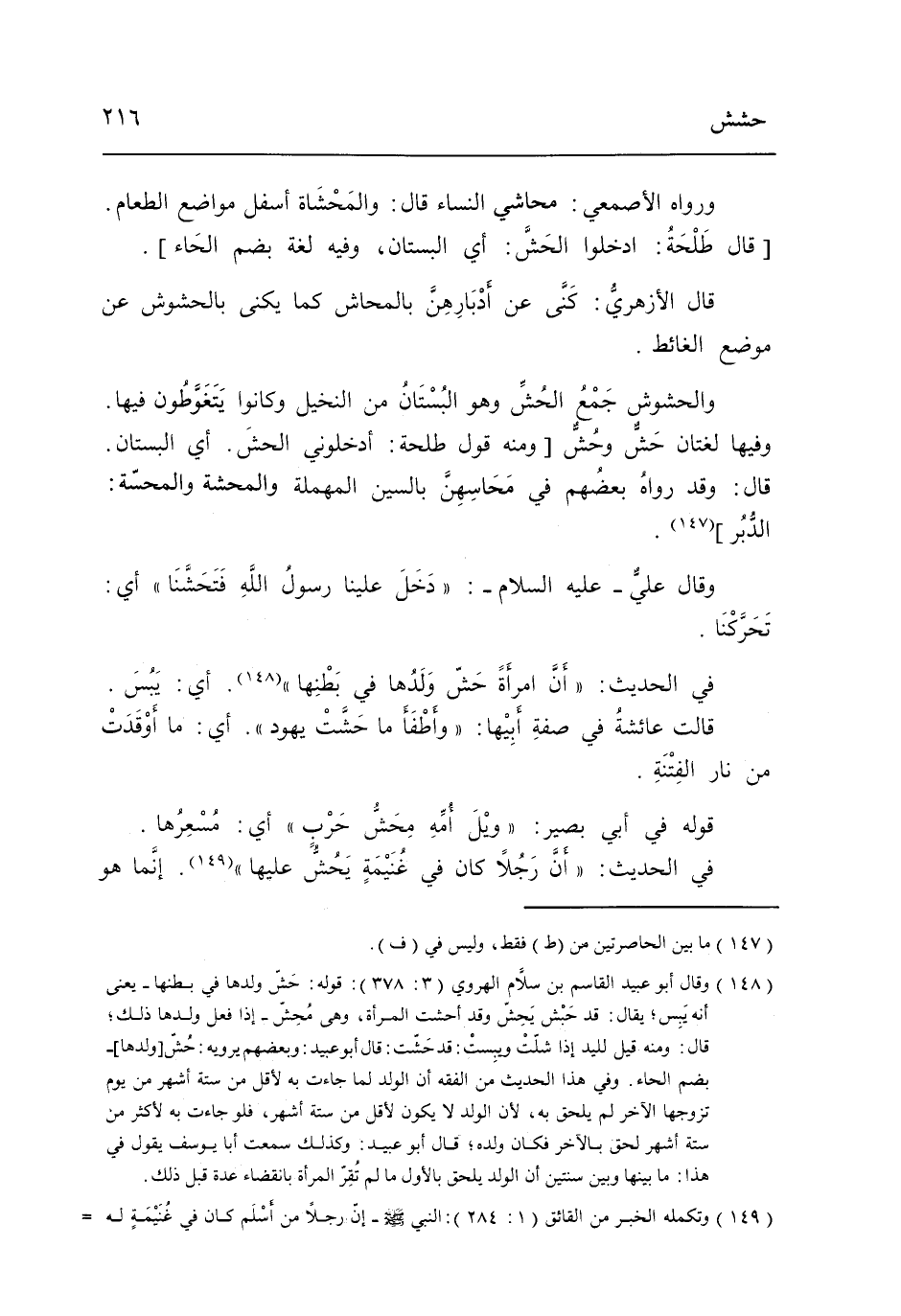 وَرَوَاهُ الْأَصْمَعِي محاشي النِّسَاء قَالَ والمحشاة أَسْفَل مَوَاضِع الطَّعَام. قَالَ طَلْحَة ادخُلُوا الحش أَي الْبُسْتَان وَفِيه لُغَة بِضَم الْحَاء.