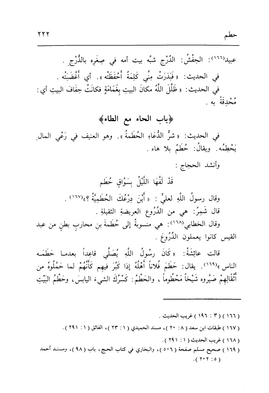 وَقَالَ الْخطابِيّ هِيَ منسوبة إِلَى حطمة بن محَارب بطن من عبد الْقَيْس كَانُوا يعْملُونَ الدروع.