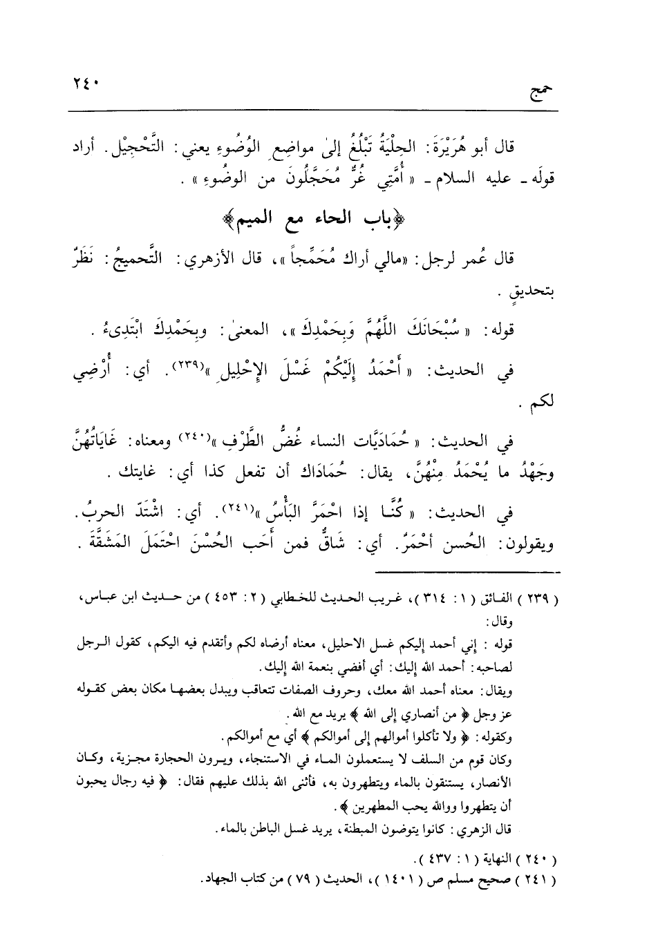 قَالَ أَبُو هُرَيْرَة الْحِلْية تبلغ إِلَى مَوَاضِع الْوضُوء يَعْنِي التحجيل أَرَادَ قَوْله عَلَيْهِ السَّلَام أمتِي عر محجلون من الْوضُوء.