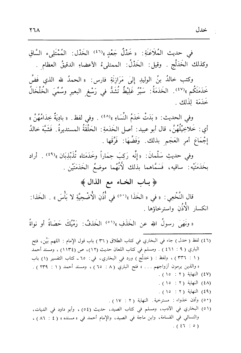 فِي حَدِيث الْمُلَاعنَة خذل جعد الخذل الممتلئ السَّاق وَكَذَلِكَ الخدلج وَقيل الخذل الممتلئ الْأَعْضَاء الدَّقِيق الْعِظَام.