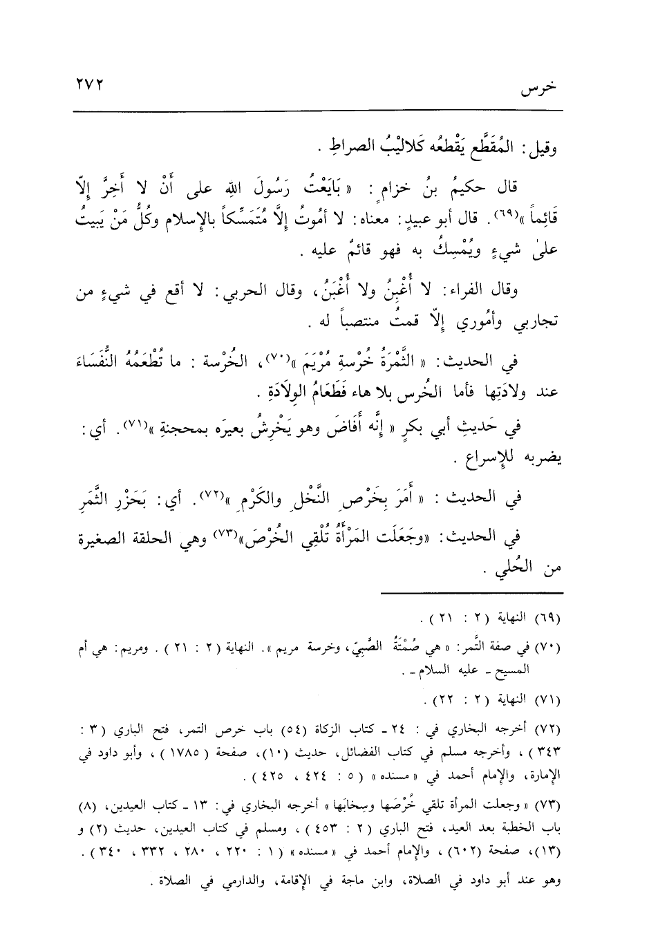 قَالَ حَكِيم بن حزَام بَايَعت رَسُول الله عَلَى أَن لَا أخر إِلَّا قَائِما قَالَ أَبُو عبيد مَعْنَاهُ لَا أَمُوت إِلَّا متمسكا بِالْإِسْلَامِ وكل من يبيت عَلَى شَيْء ويمسك بِهِ فَهُوَ قَائِم عَلَيْهِ.