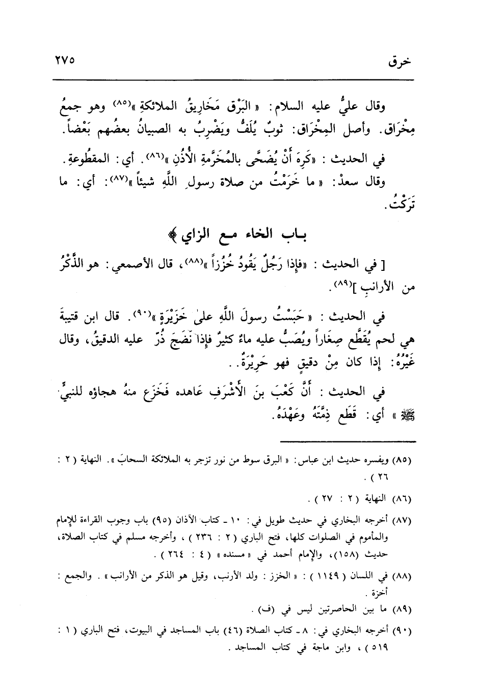 وَقَالَ عَلّي عَلَيْهِ السَّلَام الْبَرْق مخاريق الْمَلَائِكَة وَهُوَ جمع مِخْرَاق وأصل المخراق ثوب يلف وَيضْرب بِهِ الصّبيان بَعضهم بَعْضًا.