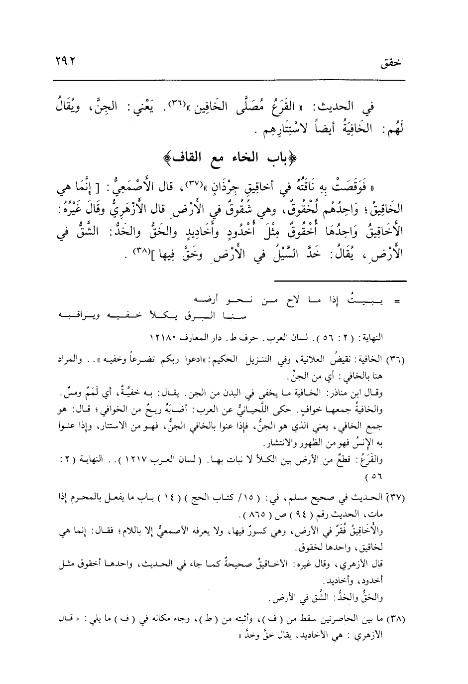 فوقصت بِهِ نَاقَته فِي أخاقيق جرذان قَالَ الْأَصْمَعِي إِنَّمَا هِيَ الخاقيق واحدهم لخقوق وَهِي شقوق فِي الأَرْض قَالَ الْأَزْهَرِي وَقَالَ غَيره الأخاقيق وَاحِدهَا أخقوق مثل أخدُود وأخاديد والخق والخد الشق فِي الأَرْض يُقَال خد السَّيْل فِي الأَرْض وخق فِيهَا.