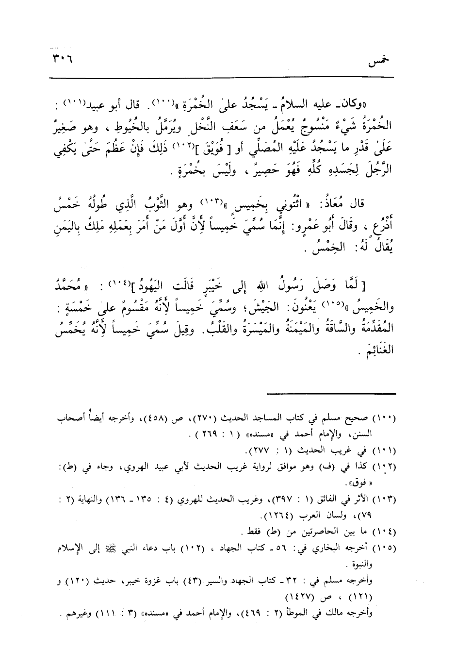 وَكَانَ عَلَيْهِ السَّلَام يسْجد عَلَى الْخمْرَة قَالَ أَبُو عبيد الْخمْرَة شَيْء منسوج يعْمل من سعف النّخل ويرمل بالخيوط وَهُوَ صَغِير عَلَى قدر مَا يسْجد عَلَيْهِ الْمُصَلِّي أَو فويق ذَلِك فَإِن عظم حَتَّى يَكْفِي الرجل لجسده كُله فَهُوَ حَصِير وَلَيْسَ بخمرة.