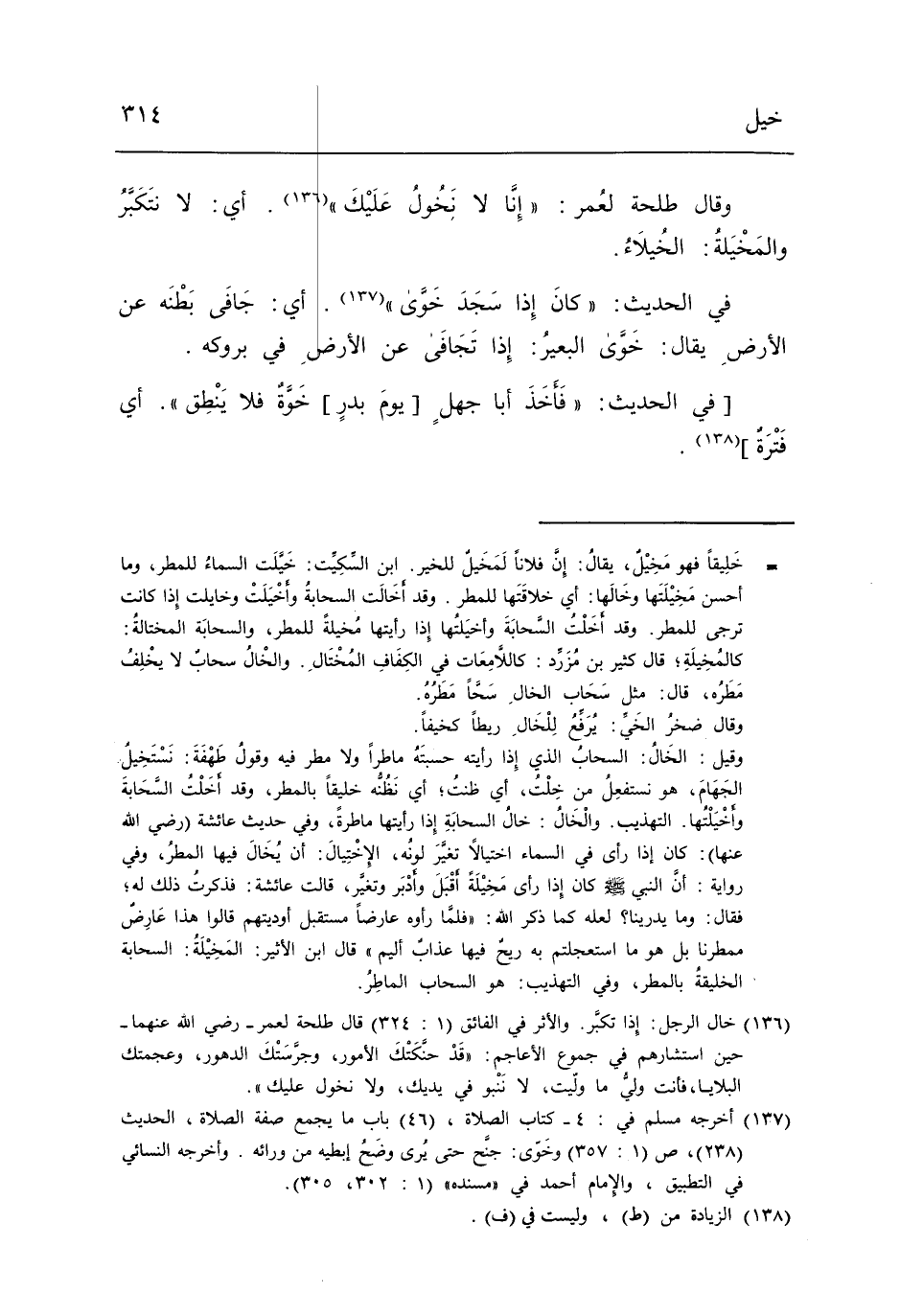 وَقَالَ طَلْحَة لعمر إِنَّا لَا نخول عَلَيْك أَي لَا نتكبر والمخيلة الْخُيَلَاء.