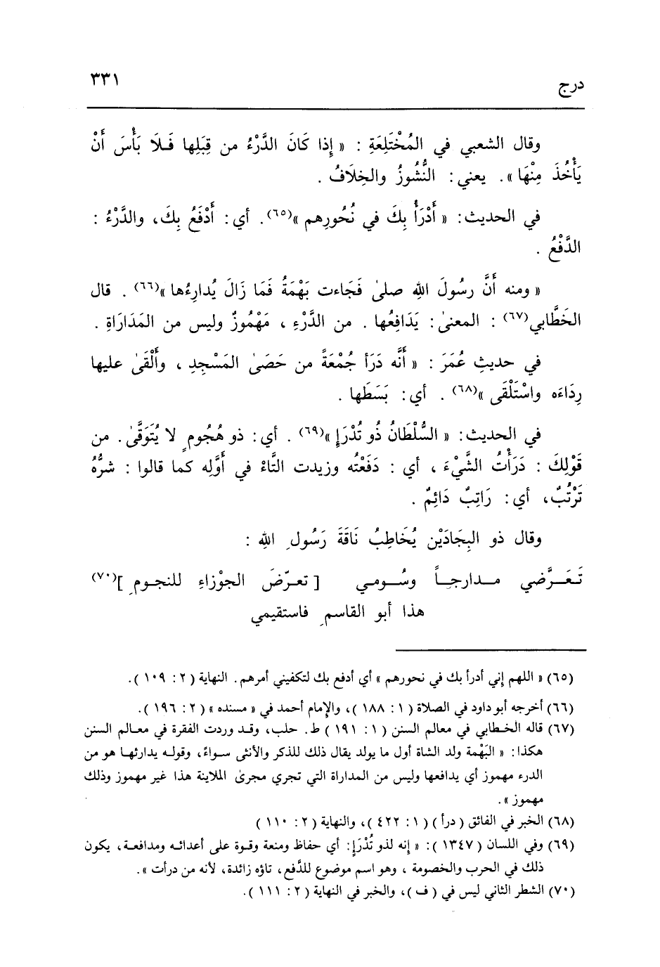 وَمِنْه أَن رَسُول الله صَلَّى فَجَاءَت بهمة فَمَا زَالَ يدارءها قَالَ الْخطابِيّ الْمَعْنى يدافعها من الدرء مَهْمُوز وَلَيْسَ من المداراة.