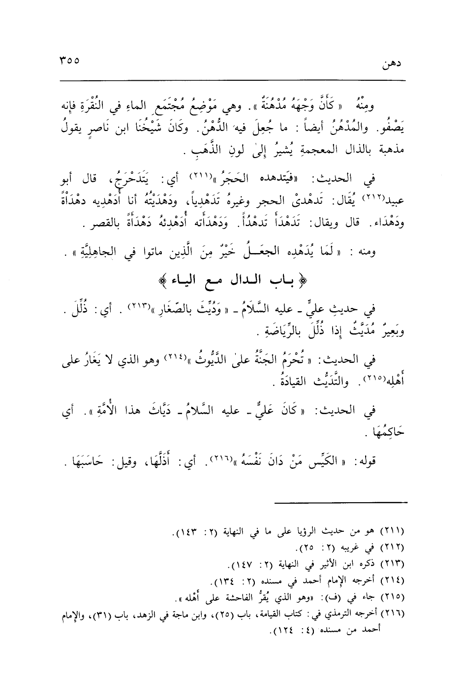 وَمِنْه كَأَن وَجهه مدهنة وَهِي مَوضِع مُجْتَمع المَاء فِي النقرة فَإِنَّهُ يصفو والمدهن أَيْضا مَا جعل فِيهِ الدّهن وَكَانَ شَيخنَا ابْن نَاصِر يَقُول مذهبَة بِالذَّالِ الْمُعْجَمَة يُشِير إِلَى لون الذَّهَب.