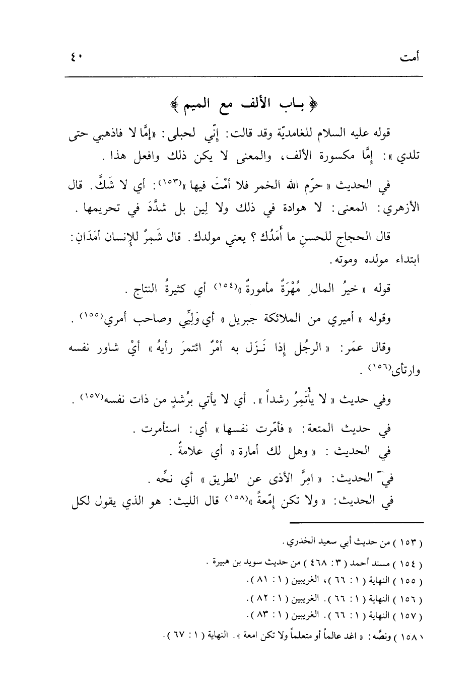 فِي الحَدِيث حرم الله الْخمر فَلَا أمت فِيهَا أَي لَا شكّ قَالَ الْأَزْهَرِي الْمَعْنى لَا هوادة فِي ذَلِك وَلَا لين بل شدد فِي تَحْرِيمهَا.
