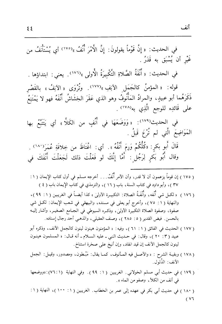 فِي الحَدِيث أَنَفَة الصَّلَاة التَّكْبِيرَة الأولَى يَعْنِي ابْتِدَاؤُهَا.