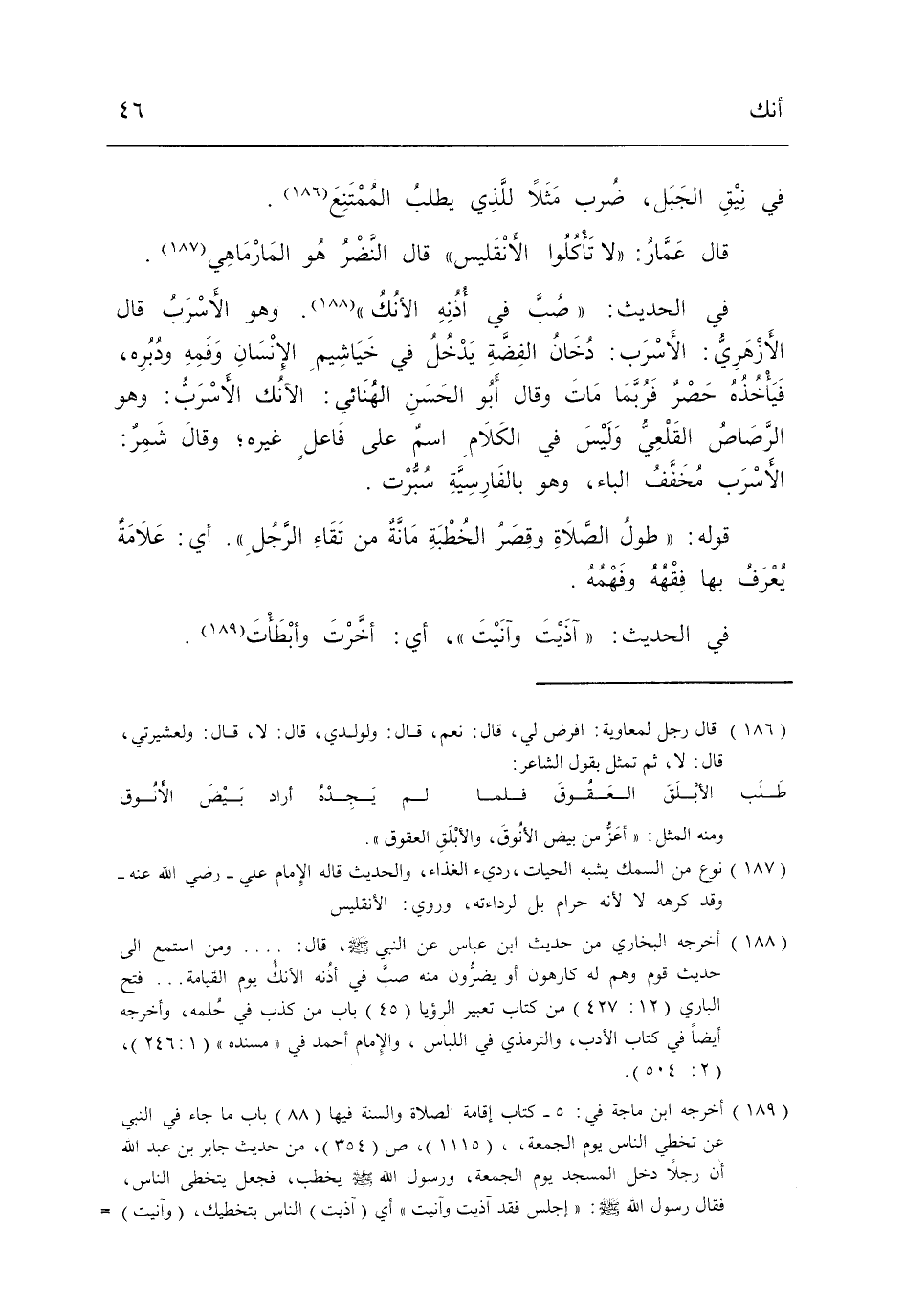 فِي الحَدِيث صب فِي أُذُنه الآنك وَهُوَ الأسرب قَالَ الْأَزْهَرِي الأسرب دُخان الْفضة يدْخل فِي خياشيم الْإِنْسَان وفمه وَدبره فَيَأْخذهُ حصر فَرُبمَا مَاتَ وَقَالَ أَبُو الْحسن الْهنائِي الآنك الأسرب وَهُوَ الرصاص القلعي وَلَيْسَ فِي الْكَلَام اسْم عَلَى فَاعل غَيره وَقَالَ شمر الأسرب مخفف الْبَاء وَهُوَ بِالْفَارِسِيَّةِ سبرت.