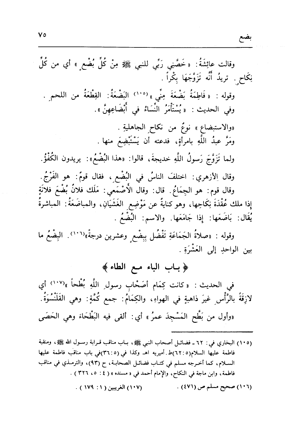 وَقَوله فَاطِمَة بضعَة مني الْبضْعَة الْقطعَة من اللَّحْم.
