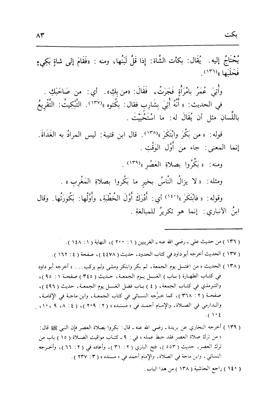 قَوْله من بكر وابتكر قَالَ ابْن قُتَيْبَة لَيْسَ المُرَاد بِهِ الْغَدَاة إِنَّمَا الْمَعْنى جَاءَ من أول الْوَقْت.