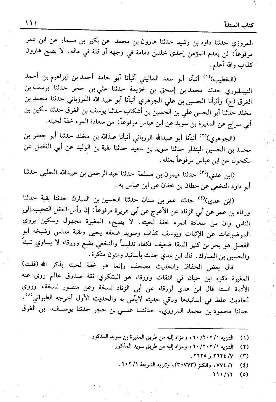 (الْخَطِيب) أَنْبَأنَا أَبُو سعد الْمَالِينِي أَنْبَأنَا أَبُو حَامِد أَحْمَد بْن إِبْرَاهِيم بْن أَحْمَد النَّيْسَابُورِي حَدَّثَنَا مُحَمَّد بْن إِسْحَاق بْن خُزَيْمَة حَدَّثَنَا عَلِيّ بْن حجر حَدَّثَنَا يُوسُف بْن الْغَرق (ح) وأنبأنا الْحُسَيْن بْن عَليّ الْجَوْهَرِي أَنْبَأنَا أَبُو عُبَيْد الله المرزباني حَدَّثَنَا مُحَمَّد بْن مخلد حَدَّثَنَا أَبُو الْحَسَن عَلِيّ بْن الْحُسَيْن بْن أشكاب حَدَّثَنَا يُوسُف بْن الْغَرق حَدَّثَنَا سكين بْن أَبِي سراج عَن الْمُغيرَة بْن سُوَيْد عَنِ ابْنِ عَبَّاسٍ مَرْفُوعًا: مِنْ سَعَادَةِ الْمَرْءِ خِفَّةُ لِحْيَتِهِ.