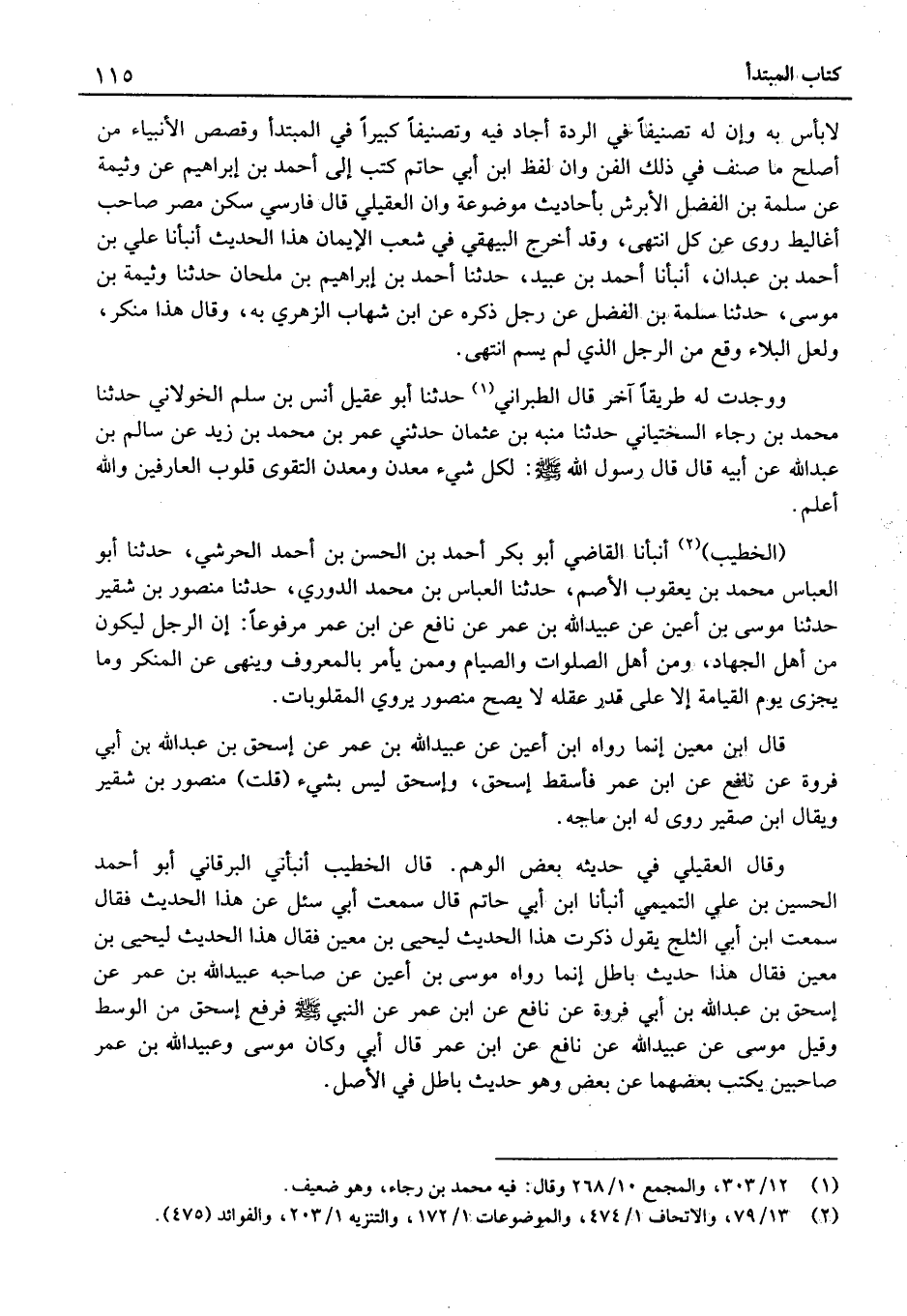 (الْخَطِيب) أَنْبَأنَا القَاضِي أَبُو بَكْر أَحْمَد بْن الْحَسَن بْن أَحْمَد الْحَرَشِي، حَدَّثَنَا أَبُو الْعَبَّاس مُحَمَّد بْن يَعْقُوب الْأَصَم، حَدَّثَنَا الْعَبَّاس بْن مُحَمَّد الدوري، حَدَّثَنَا مَنْصُور بْن شقير حَدَّثَنَا مُوسَى بْن أعين عَن عُبَيْد الله بْن عُمَر عَن نَافِع عَنِ ابْنِ عُمَرَ مَرْفُوعا: أِنَّ الرَّجُلَ لَيَكُونُ مِنْ أَهْلِ الْجِهَادِ، وَمِنْ أَهْلِ الصَّلَوَاتِ وَالصِّيَامِ وَمِمَّنْ يَأْمُرُ بِالْمَعْرُوفِ وَيَنْهَى عَنِ الْمُنْكَرِ وَمَا يُجْزَى يَوْمَ الْقِيَامَة إِلَّا على قَدْرَ عَقْلِهِ لَا يَصِحُّ مَنْصُور يروي المقلوبات.
