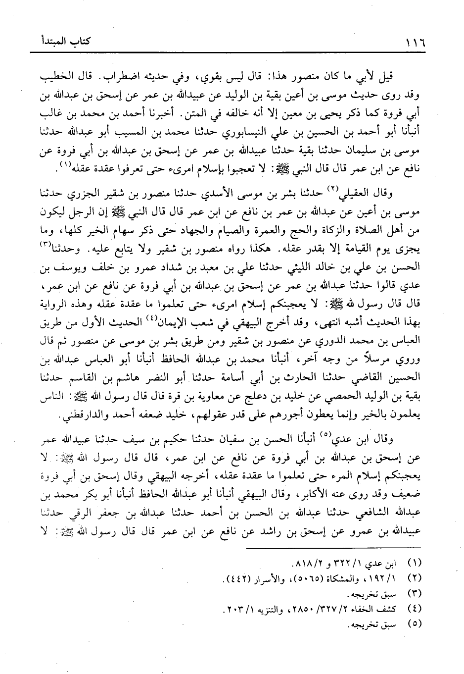 وَحَدَّثَنَا الْحَسَن بْن عَلِيّ بْن خَالِد اللَّيْثِيّ حَدَّثَنَا عَلِيّ بْن معبد بْن شَدَّاد عَمْرو بْن خلف ويوسف بْن عدي قَالُوا حَدَّثَنَا عَبْد الله بْن عُمَر عَن إِسْحَاق بْن عَبْد الله بْن أَبِي فَرْوَة عَن نَافِع عَنِ ابْنِ عُمَرَ، قَالَ قَالَ رَسُول الله: لَا يُعْجِبَنَّكُمْ إِسْلامُ امْرِئٍ حَتَّى تَعْلَمُوا مَا عُقْدَةُ عَقْلِهِ وَهَذِه الرِّوَايَة بِهذا الحَدِيث أشبه انْتهى، وَقد أخرج الْبَيْهَقِيّ فِي شعب الْإيِمَان الحَدِيث الأول من طَرِيق الْعَبَّاس بْن مُحَمَّد الدوري عَن مَنْصُور بْن شقير وَمن طَرِيق بشر بْن مُوسَى عَن مَنْصُور ثُمَّ قَالَ وَرُوِيَ مُرْسلا من وَجه آخر، أَنْبَأنَا مُحَمَّد بْن عَبْد الله الْحَافِظ أَنْبَأنَا أَبُو الْعَبَّاس عبد الله بن حُسَيْن القَاضِي حَدَّثَنَا الْحَارِث بْن أَبِي أُسَامَة حَدَّثَنَا أَبُو النَّضر هَاشم بْن الْقَاسِم حَدَّثَنَا بَقِيَّة بْن الْوَلِيد الْحِمصِي عَن خُلَيْد بْن دعْلج عَن مُعَاوِيَةَ بْنِ قُرَّةَ قَالَ قَالَ رَسُول الله: النَّاس يعلمُونَ بِالْخَيرِ وإنّما يُعطون أُجُورهم عَلَى قدر عقولِهم، خُلَيْدٌ ضَعَّفَهُ أَحْمَدُ وَالدَّارَقُطْنِيُّ.