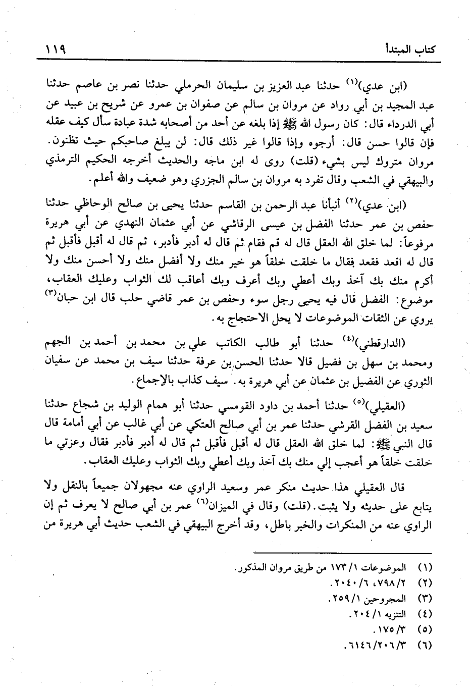 (الْعقيلِيّ) حَدَّثَنَا أَحْمَد بْن دَاوُد القومسي حَدَّثَنَا أَبُو همام الْوَلِيد بْن شُجَاع حَدَّثَنَا سَعِيد بْن الْفضل الْقُرَشِيّ حَدَّثَنَا عُمَر بْن أَبِي صالِح الْعَتكِي عَن أَبِي غَالب عَن أَبِي أُمَامَةَ قَالَ قَالَ النَّبِي: لَمَّا خَلَقَ اللَّهُ الْعَقْلَ قَالَ لَهُ أَقْبِلْ فَأَقْبَلَ ثُمَّ قَالَ لَهُ أَدْبِرْ فَأَدْبَرَ فَقَالَ وَعِزَّتِي مَا خَلَقْتُ خَلْقًا هُوَ أَعْجَبُ إِلَيَّ مِنْكَ بِكَ آخُذُ وَبِكَ أُعْطِي وَبِكَ الثَّوَابُ وَعَلَيْكَ الْعِقَابُ.