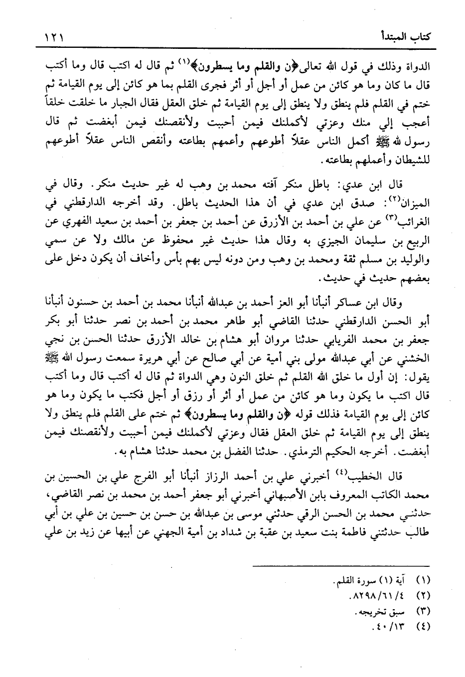 وَقَالَ ابْن عَسَاكِر أَنْبَأنَا أَبُو الْعِزّ أَحْمَد بْن عَبْد الله أَنْبَأنَا مُحَمَّد بْن أَحْمَد بْن حسنون أَنْبَأنَا أَبُو الْحَسَن الدَّارَقُطْنِيّ حَدَّثَنَا القَاضِي أَبُو طَاهِر مُحَمَّد بْن أَحْمَد بْن نصر حَدَّثَنَا أَبُو بَكْر جَعْفَر بْن مُحَمَّد الْفرْيَابِيّ حَدَّثَنَا مَرْوَان أَبُو هِشَام بْن خَالِد الْأَزْرَق حَدَّثَنَا الْحَسَن بْن نجي الْخُشَنِي عَن أَبِي عَبْد الله مولى بني أُميَّة عَن أَبِي صَالح عَن أَبِي هُرَيْرَةَ سَمِعْتُ رَسُول الله يَقُولُ: إِنَّ أَوَّلَ مَا خَلَقَ اللَّهُ الْقَلَمَ ثُمَّ خَلَقَ النُّونَ وَهِيَ الدَّوَاةُ ثُمَّ قَالَ لَهُ اكْتُبْ قَالَ وَمَا أَكْتُبُ قَالَ اكْتُبْ مَا يَكُونُ وَمَا هُوَ كَائِنٌ مِنْ عَمَلٍ أَوْ أَثَرٍ أَوْ رِزْقٍ أَوْ أَجَلٍ فَكَتَبَ مَا يَكُونُ وَمَا هُوَ كَائِنٌ إِلَى يَوْمِ الْقِيَامَةِ فَذَلِكَ قَوْلُهُ {ن والقلم وَمَا يسطرون} ثُمَّ خَتَمَ عَلَى الْقَلَمِ فَلَمْ ينْطق وَلَا ينْطق إِلَى يَوْم الْقِيَامَة ثُمَّ خَلَقَ الْعَقْلَ فَقَالَ وَعِزَّتِي لأُكَمِّلنَّكَ فِيمَنْ أَحْبَبْتَ وَلأُنْقِصَنَّكَ فِيمَنْ أَبْغَضْتَ.