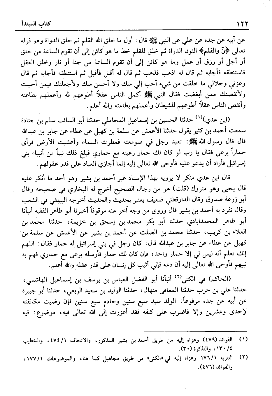 (ابْن عدى) حَدَّثَنَا الْحُسَيْن بْن إِسْمَاعِيل الْمحَامِلِي حَدَّثَنَا أَبُو السَّائِب سلم بْن جُنَادَة سمعتُ أَحْمَد بْن كثير يَقُولُ حَدَّثَنَا الْأَعْمَش عَن سَلمَة بْن كهيل عَن عَطاء عَن جَابِر بْن عَبْد الله قَالَ قَالَ رَسُول الله: تعبد رجلٌ فِي صومعته فمطرت السَّمَاء وأعشبت الأَرْض فَرَأى حمارا يرْعَى فَقَالَ يَا رب لَو كَانَ لَك حمَار رَعيته مَعَ حماري فَبلغ ذَلِكَ نَبيا من أَنْبيَاء بني إِسْرَائِيل فَأَرَادَ أَن يَدْعُو عَلَيْهِ فَأوحى الله تَعَالَى إِلَيْهِ إنّما أجازي الْعباد عَلَى قدر عقولِهم.