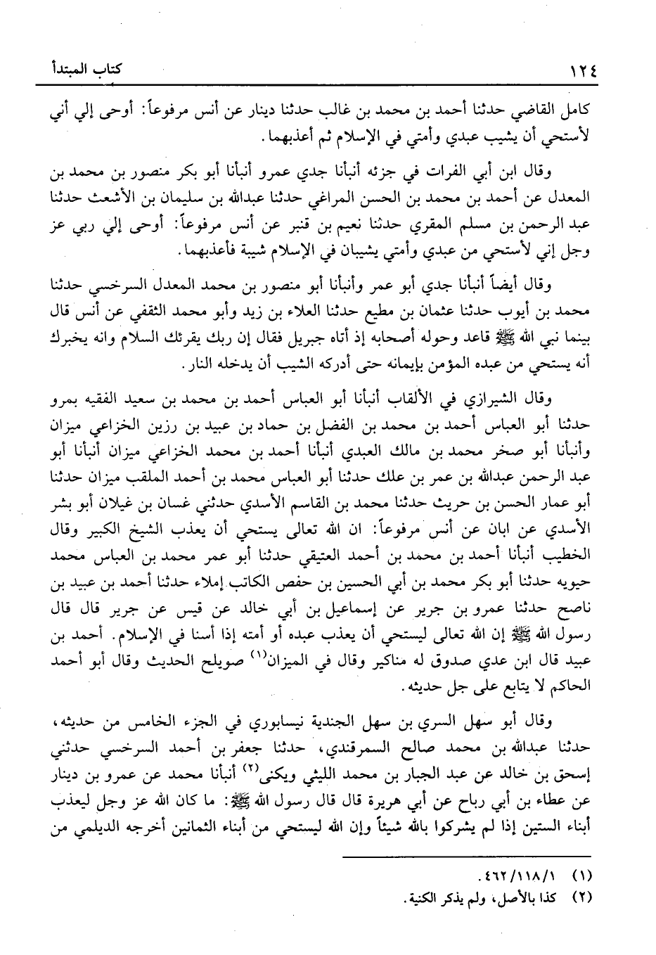 وَقَالَ الشِّيرَازِيّ فِي الألقاب أَنْبَأنَا أَبُو الْعَبَّاس أَحْمَد بْن مُحَمَّد بْن سَعِيد الْفَقِيه بِمرو حَدَّثَنَا أَبُو الْعَبَّاس أَحْمَد بْن مُحَمَّد بْن الْفضل بْن حَمَّاد بْن عُبَيْد بْن رزين الْخُزَاعِيّ ميزَان وأنبأنا أَبُو صَخْر مُحَمَّد بْن مَالك الْعَبْدي أَنْبَأنَا أَحْمَد بْن مُحَمَّد الْخُزَاعِيّ ميزَان أَنْبَأنَا أَبُو عَبْد الرَّحْمَن عَبْد الله بْن عُمَر بْن علك حَدَّثَنَا أَبُو الْعَبَّاس مُحَمَّد بْن أَحْمَد الملقب ميزَان حَدَّثَنَا أَبُو عمار الْحَسَن بْن حُرَيْث حَدَّثَنَا مُحَمَّد بْن الْقَاسِم الْأَسدي حَدثنَا غَسَّان بْن غيلَان أَبُو بشر الْأَسدي عَن أبان عَن أَنَسٍ مَرْفُوعا: إِن الله تَعَالَى يستحي أَنْ يُعَذِّبَ الشَّيْخَ الْكَبِيرَ وَقَالَ الْخَطِيب أَنْبَأنَا أَحْمَد بْن مُحَمَّد بْن أَحْمَد العتيقي حَدَّثَنَا أَبُو عُمَر مُحَمَّد بْن الْعَبَّاس مُحَمَّد حيوية حَدَّثَنَا أَبُو بَكْر مُحَمَّد بْن أَبِي الْحُسَيْن بْن حَفْص الْكَاتِب إملاء حَدَّثَنَا أَحْمَد بْن عُبَيْد بْن نَاصح حَدَّثَنَا عَمْرو بْن جرير عَن إِسْمَاعِيل بْن أَبِي خَالِد عَن قيس عَن جَرِيرٍ قَالَ قَالَ رَسُولُ اللَّهِ إِنَّ اللَّهَ تَعَالَى لَيَسْتَحِي أَنْ يُعَذِّبَ عَبْدَهُ أَوْ أَمَتَهُ إِذَا أَسَنَّا فِي الإِسْلامِ.