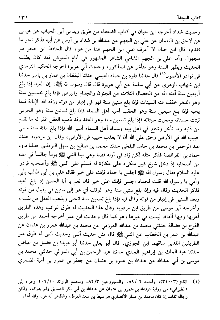 وَحَدِيث شَدَّاد أَخْرَجَهُ ابْن حبَان فِي كتاب الضُّعَفَاء من طَرِيق زيد بْن أَبِي الْحباب عَن عِيسَى عَن لَاحق بْن النُّعْمَان عَن عَلِيّ بْن الجهم عَن عَبْد الله بْن شَدَّاد بْن أَوْس عَن أَبِيهِ فَذكر نَحْو مَا تقدم، قَالَ ابْن حبَان لَا أعرف عَليّ ابْن الجهم هَذَا من هُوَ، قَالَ الْحَافِظ ابْن حجر هُوَ مَجْهُول وَأما عَلِيّ بْن الجهم الشَّامي الشَّاعِر الْمَشْهُور فِي أَيَّام المتَوَكل فقد كَانَ يطْلب الحَدِيث وَيظْهر السّنة وَهُوَ مُتَأَخّر عَن الْمَذْكُور، وَحَدِيث أَبِي هُرَيْرَةَ أَخْرَجَهُ الْحَكِيم التِّرْمِذِيّ فِي نَوَادِر الْأُصُول قَالَ حَدَّثَنَا دَاوُد بْن حَمَّاد الْعَبْسِي حَدَّثَنَا الْيَقظَان بْن عمار بْن يَاسر حَدَّثَنَا ابْن شهَاب الزُّهْرِيّ عَن أَبِي سَلمَة عَن أَبِي هُرَيْرَةَ قَالَ قَالَ رَسُول الله: إِنَّ الْعَبْدَ إِذَا بَلَغَ أَرْبَعِينَ سَنَةً آمَنَهُ اللَّهُ مِنَ الْخِصَالِ الثَّلَاث من الْجُنُون والجذام والبرص فَإِذَا بَلَغَ خَمْسِينَ سَنَةً وَهُوَ الدَّهْرُ خَفَّفَ عَنْهُ السَيِّئَاتِ فَإِذَا بَلَغَ سِتِّينَ سَنَةً فَهُوَ فِي إِدْبَارٍ مِنْ قُوَّتِهِ رَزَقَهُ اللَّهُ الإِنَابَةَ فِيمَا يُحِبُّهُ فَإِذَا بَلَغَ سَبْعِينَ سَنَةً وَهُوَ الْحُقْبُ أَحَبَّهُ أَهْلُ السَّمَاءِ فَإِذَا بَلَغَ ثَمَانِينَ سنة وَهُوَ الحرس ثبتَتْ حَسَنَاته وَمُحِيَتْ سَيِّئَاتُهُ فَإِذَا بَلَغَ تِسْعِينَ سنة وَهُوَ العقد وَقد ذَهَبَ الْعَقْلُ غُفِرَ لَهُ مَا تَقَدَّمَ من ذَنبه وَمَا تَأَخّر وشفع فِي أَهْلِ بَيْتِهِ وَسَمَّاهُ أَهْلُ السَّمَاءِ أَسِيرَ اللَّهِ فَإِذَا بَلَغَ مِائَةَ سَنَةٍ سُمِّيَ حَبِيبَ اللَّهِ فِي الأَرْضِ وَحَقٌّ عَلَى اللَّهِ أَنْ لَا يُعَذِّبَ حَبِيبَهُ فِي الأَرْضِ، وَقَالَ ابْن مرْدَوَيْه حَدَّثَنَا عَبْد الرَّحْمَن بْن مُحَمَّد بْن حَامِد الْبَلْخِي حَدَّثَنَا مُحَمَّد بْن صالِح بْن سهل التِّرْمِذِيّ حَدَّثَنَا دَاوُد حَمَّاد بْن الفرافصة فَذكر مثله لَكِن زَاد فِي أَوله قصَّة وَهِي بَينا النَّبِي يَوْمًا جَالِسا فِي عدَّة من أَصْحَابه إِذْ دخل شيخ كَبِير متكئ عَلَى عكازة لَهُ فَسلم على النَّبِي وَأَصْحَابه فَردُّوا عَلَيْهِ السَّلَام فَقَالَ رَسُول الله اجْلِسْ يَا حَمَّاد فَإنَّك عَلَى خير فَقَالَ عَلِيّ بْن أَبِي طَالب بِأبي وَأمي يَا رَسُول الله قلت لِحماد اجْلِسْ فَإنَّك عَلَى خير قَالَ نعم يَا أَبَا الْحَسَن إِذا بلغَ العبدُ فَذكر الحَدِيث وَقَالَ فِيهِ وَإِذا بلغ سِتِّينَ سنة وَهُوَ الْوَقْف أَي هُوَ إِلَى سِتِّينَ فِي إقبال من قوته وَبعد السِّتين فِي إدبار من قوته وَقَالَ فِيهِ فَإِذا بلغ تسعين سنة انحنى وَيذْهب الْعقل من نَفسه، وَأخرجه أَبُو مُوسَى من طَرِيق ابْن مرْدَوَيْه وَقَالَ هَذَا الحَدِيث لَهُ طرق غرائب وَهَذِه الطَّرِيق أغربها وفيهَا أَلْفَاظ لَيست فِي غَيرهَا وَهُوَ كَمَا قَالَ وَحَدِيث ابْن عُمَر أَخْرَجَهُ أَحْمَد من طَرِيق الْفرج بْن فضَالة حدَّثَنِي مُحَمَّد بْن عَبْد الله الْعَرْزَمِي عَن مُحَمَّد بْن عَبْد الله عَمْرو بْن عُثْمَان عَن عَبْدِ الله بْن عُمَر بْن الْخَطَّاب عَن النَّبِي قَالَ مثل حَدِيث أنس وَحَدِيث أنس لَهُ طرق غير الطَّرِيقَيْنِ اللَّذين ساقهما ابْن الْجَوْزِيّ، قَالَ أَبُو يَعْلَى حَدَّثَنَا أَبُو عُبَيْدَة بْن فُضَيْل بْن عِيَاض حَدَّثَنَا عَبْد الْملك بْن إِبْرَاهِيم الجدي حَدثنَا عَبْد الرَّحْمَن بْن أَبِي الموَالِي حدَّثَنِي مُحَمَّد بْن مُوسَى بْن أَبِي عَبْد الله عَن عَبْد الله بْن عَمْرو بْن عُثْمَان عَن جَعْفَر بْن عَمْرو بن أُميَّة الضمرِي