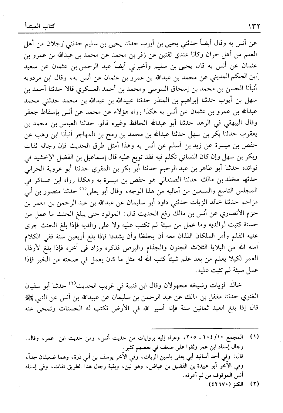 عَن أنس بِهِ وَقَالَ أَيْضا حدَّثَنِي يَحْيَى بْن أَيُّوب حَدَّثَنَا يَحْيَى بْن سليم حدَّثَنِي رجلَانِ من أهل الْعلم من أهل حران وَكَانَا عِنْدِي ثقتين عَن زفر بْن مُحَمَّد عَن مُحَمَّد بْن عَبْد الله بْن عَمْرو بْن عُثْمَان عَن أنس بِهِ قَالَ يَحْيَى بْن سليم وَأَخْبرنِي أَيْضا عَبْد الرَّحْمَن بْن عُثْمَان عَن سعيد ابْن الحكم الْمَدِينِيّ عَن مُحَمَّد بن عَبْد الله بْن عَمْرو بْن عُثْمَان عَن أنس بِهِ، وَقَالَ ابْن مرْدَوَيْه أَنبأَنَا الْحسن بن مُحَمَّد بْن إِسْحَاق السُّوسِي وَمُحَمَّد بْن أَحْمَد العسكري قَالَا حَدَّثَنَا أَحْمَد بْن سهل بْن أَيُّوب حَدَّثَنَا إِبْرَاهِيم بْن الْمُنْذر حَدَّثَنَا عُبَيْد الله بْن عَبْد الله بْن مُحَمَّد حدَّثَنِي مُحَمَّد عَبْد الله بْن عَمْرو بْن عُثْمَان عَن أنس بِهِ هَكَذَا رَوَاهُ هَؤُلَاءِ عَن مُحَمَّد عَن أنس بِإِسْقَاط جَعْفَر وَقَالَ الْبَيْهَقِيّ فِي الزّهْد حَدَّثَنَا أَبُو عَبْد الله الْحَافِظ وَغَيره قَالُوا حَدَّثَنَا الْعَبَّاس بْن مُحَمَّد بْن يَعْقُوب حَدَّثَنَا بَكْر بْن سهل حَدَّثَنَا عَبْد الله بْن مُحَمَّد بْن رمح بْن المُهَاجر أَنْبَأنَا ابْن وهب عَن حَفْص بْن ميسرَة عَن زيد بْن أسلم عَن أنس بِهِ وَهَذَا أمثل طرق الحَدِيث فَإِن رِجَاله ثِقَات وَبكر بْن سهل وَإِن كَانَ النَّسَائِيّ تكلم فِيهِ فقد توبع عَلَيْهِ قَالَ إِسْمَاعِيل بْن الْفضل الإخشيد فِي فَوَائده حَدَّثَنَا أَبُو طَاهِر بْن عَبْد الرَّحِيم حَدَّثَنَا أَبُو بَكْر بن الْمقري حَدثنَا أَبُو عرُوبَة الْحَرَّانِي حدثها مخلد بْن مَالك حَدَّثَنَا الصَّنْعَانِيّ هُوَ حَفْص بْن ميسرَة بِهِ وَهَكَذَا رَوَاهُ ابْن عَسَاكِر فِي الْمجْلس التَّاسِع وَالسبْعين من أَمَالِيهِ من هَذَا الْوَجْه، وَقَالَ أَبُو يَعْلَى حَدَّثَنَا مَنْصُور بْن أَبِي مُزَاحم حَدَّثَنَا خَالِد الزيات حدَّثَنِي دَاوُد أَبُو سُلَيْمَان عَن عَبْد الله بْن عَبْد الرَّحْمَن بْن معمر بْن حزم الْأنْصَارِيّ عَن أَنَسِ بْنِ مَالِكٍ رَفَعَ الْحَدِيثَ قَالَ: الْمَوْلُودُ حَتَّى يَبْلُغَ الْحِنْثَ مَا عَمِلَ مِنْ حَسَنَةٍ كُتِبَتْ لِوَالِدَيْهِ وَمَا عَمِلَ مِنْ سَيِّئَةٍ لَمْ تُكْتَبْ عَلَيْهِ وَلا عَلَى وَالِدَيْهِ فَإِذَا بَلَغَ الْحِنْثَ جَرَى عَلَيْهِ الْقَلَمُ وَأُمِرَ الْمَلَكَانِ اللَّذَانِ مَعَهُ أَنْ يَحْفَظَا وَأَنْ يُشَدِّدَا فَإِذا بلغ أَرْبَعِينَ سنة فَفِي الْكَلَام آمَنَهُ اللَّهُ مِنَ الْبَلايَا الثَّلاثِ الْجُنُونِ وَالْجُذَامِ وَالْبَرَصِ فَذكره وَزَاد فِي آخِره فَإِذا بلغ لأرذل الْعُمر لكيلا يعلم من بعد علمٍ شَيْئا كتب الله لَهُ مثل مَا كَانَ يعْمل فِي صِحَّته من الْخَيْر فَإِذا عمل سَيِّئَة لَم تثبت عَلَيْهِ.