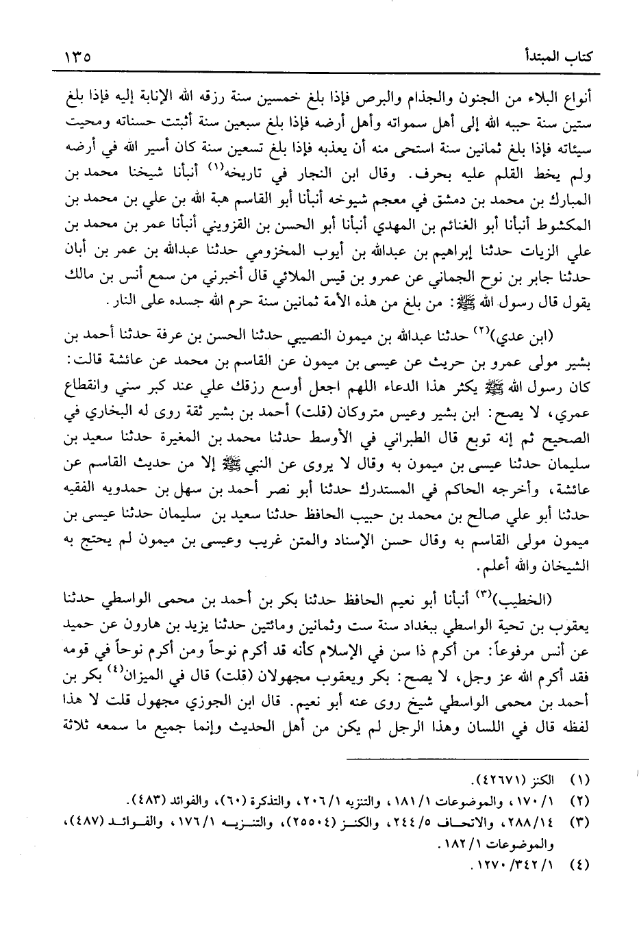 أَنْوَاعِ الْبَلاءِ مِنَ الْجُنُونِ وَالْجُذَامِ وَالْبَرَصِ فَإِذَا بَلَغَ خَمْسِينَ سَنَةً رَزَقَهُ اللَّهُ الإِنَابَةَ إِلَيْهِ فَإِذَا بَلَغَ سِتِّينَ سَنَةً حَبَّبَهُ اللَّهُ إِلَى أَهْلِ سَمَاوَاتِهِ وَأَهْلِ أَرْضِهِ فَإِذَا بَلَغَ سَبْعِينَ سَنَةً أُثْبِتَتْ حَسَنَاتُهُ وَمُحِيَتْ سَيِّئَاتُهُ فَإِذَا بَلَغَ ثَمَانِينَ سَنَةً اسْتَحَى مِنْهُ أَنْ يُعَذِّبَهُ فَإِذَا بَلَغَ تِسْعِينَ سَنَةً كَانَ أَسِيرَ اللَّهِ فِي أَرْضِهِ وَلَمْ يُخَطَّ الْقَلَمُ عَلَيْهِ بِحَرْفٍ وَقَالَ ابْن النجار فِي تَارِيخه أَنْبَأنَا شَيخنَا مُحَمَّد بْن الْمُبَارك بن مُحَمَّد بن دمشق فِي مُعْجم شُيُوخه أَنْبَأنَا أَبُو الْقَاسِم هبة الله بْن عَلِيّ بْن مُحَمَّد بْن المكشوط أَنْبَأنَا أَبُو الْغَنَائِم بْن الْمهْدي أَنْبَأنَا أَبُو الْحَسَن بْن الْقزْوِينِي أَنْبَأنَا عُمَر بْن مُحَمَّد بْن عَليّ الزيات حَدَّثَنَا إِبْرَاهِيم بْن عَبْد الله بْن أَيُّوب المَخْزُومِي حَدَّثَنَا عَبْد الله بْن عُمَر بْن أبان حَدَّثَنَا جَابِر بْن نوح الجماني عَن عَمْرو بْن قيس الْملَائي قَالَ أَخْبرنِي من سَمِعَ أَنَسَ بْنَ مَالِكٍ يَقُولُ يَقُولُ قَالَ رَسُول الله من بلغ هَذِهِ الأُمَّةَ ثَمَانِينَ سَنَةً حَرَّمَ لله جَسَدَهُ عَلَى النَّارِ