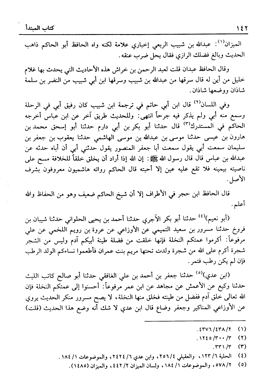 وَفِي اللِّسَان قَالَ ابْن أَبِي حاتِم فِي تَرْجَمَة ابْن شبيب كَانَ رَفِيق أَبِي فِي الرحلة وَسمع مِنْهُ أَبِي ولَمْ يذكر فِيهِ جرحا انْتهى: وَلِلْحَدِيثِ طَرِيق آخر عَن ابْن عَبَّاس أَخْرَجَهُ الْحَاكِم فِي الْمُسْتَدْرك قَالَ حَدَّثَنَا أَبُو بَكْر بْن أَبِي دارم حَدَّثَنَا أَبُو إِسْحَاق مُحَمَّد بْن هَارُون بْن عِيسَى حَدَّثَنَا مُوسَى بْن عَبْد الله بْن مُوسَى الْهَاشِمِي حَدَّثَنَا يَعْقُوب بْن جَعْفَر بْن سُلَيْمَان سمعتُ أَبِي يَقُولُ سمعتُ أَبَا جَعْفَر الْمَنْصُور يَقُولُ حدَّثَنِي أَبِي أَن أباهُ حَدثهُ عَنْ عَبْدِ اللَّهِ بْنِ عَبَّاسٍ قَالَ قَالَ رَسُول الله: إِنَّ اللَّهَ إِذَا أَرَادَ أَنْ يَخْلُقَ خَلْقًا لِلْخِلافَةِ مَسَحَ عَلَى نَاصِيَتِهِ بِيَمِينِهِ فَلا تَقَعُ عَلَيْهِ عَيْنٌ إِلا أَحَبَّتْهُ قَالَ الْحَاكِم رُوَاته هاشميون معروفون بشرف الأَصْل.