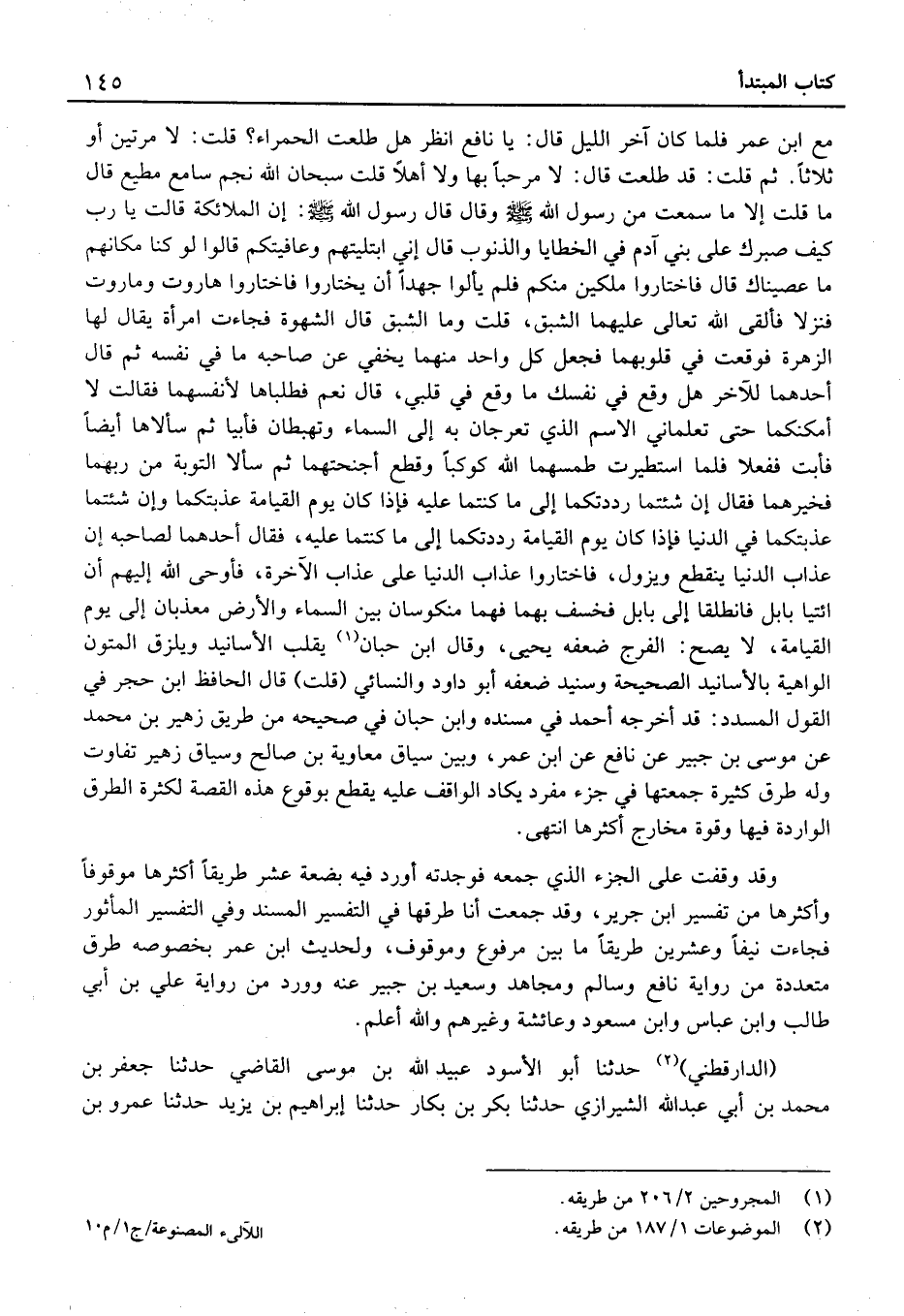 ثُمَّ قلت: قد طلعت قَالَ: لَا مرْحَبًا بِهَا وَلَا أَهلا قلتُ سُبْحَانَ الله نَجم سامع مُطِيع قَالَ مَا قلتُ إِلَّا مَا سَمِعت من رَسُول الله وَقَالَ قَالَ رَسُول الله: إِنَّ الْمَلائِكَةَ قَالَتْ يَا رَبِّ كَيْفَ صَبْرُكَ عَلَى بَنِي آدَمَ فِي الْخَطَايَا وَالذُّنُوبِ قَالَ إِنِّي ابتليتهم وعافيتكم قَالُوا لَوْ كُنَّا مَكَانَهُمْ مَا عَصَيْنَاكَ قَالَ فَاخْتَارُوا مَلَكَيْنِ مِنْكُمْ فَلَمْ يَأْلُوا جَهْدًا أَنْ يَخْتَارُوا فَاخْتَارُوا هَارُوتَ وَمَارُوتَ فَنَزَلا فَأَلْقَى اللَّهُ تَعَالَى عَلَيْهِمَا الشَّبَقَ، قُلْتُ وَمَا الشَّبَقُ قَالَ الشَّهْوَةُ فَجَاءَتِ امْرَأَةٌ يُقَالُ لَهَا الزَّهْرَةُ فَوَقَعَتْ فِي قُلُوبِهِمَا فَجَعَلَ كُلُّ وَاحِدٍ مِنْهُمَا يُخْفِي عَنْ صَاحِبِهِ مَا فِي نَفْسِهِ ثُمَّ قَالَ أَحَدُهُمَا لِلآخَرِ هَلْ وَقَعَ فِي نَفْسِكَ مَا وَقَعَ فِي قَلْبِي، قَالَ نَعَمْ فَطَلَبَاهَا لأَنْفُسِهِمَا فَقَالَتْ لَا أُمَكِّنُكُمَا حَتَّى تُعْلِمَانِي الاسْمَ الَّذِي تَعْرُجَانِ بِهِ إِلَى السَّمَاءِ وَتَهْبِطَانِ فَأَبَيَا ثُمَّ سَأَلاهَا أَيْضًا فَأَبَتْ فَفَعَلا فَلَمَّا اسْتَطْيَرَتْ طَمَسَهُمَا اللَّهُ كَوْكَبًا وَقَطَعَ أَجْنِحَتَهُمَا ثُمَّ سَأَلا التَّوْبَةَ مِنْ رَبِّهِمَا فَخَيَّرَهُمَا فَقَالَ إِنْ شِئْتُمَا رَدَدْتُكُمَا إِلَى مَا كُنْتُمَا عَلَيْهِ فَإِذَا كَانَ يَوْمُ الْقِيَامَةِ عَذَّبْتُكُمَا وَإِنْ شِئْتُمَا عَذَّبْتُكُمَا فِي الدُّنْيَا فَإِذَا كَانَ يَوْمُ الْقِيَامَةِ رَدَدْتُكُمَا إِلَى مَا كُنْتُمَا عَلَيْهِ، فَقَالَ أَحَدُهُمَا لِصَاحِبِهِ إِنَّ عَذَابَ الدُّنْيَا يَنْقَطِعُ وَيَزُولُ، فَاخْتَارُوا عَذَابَ الدُّنْيَا عَلَى عَذَابِ الآخِرَةِ، فَأَوْحَى اللَّهُ إِلَيْهِمْ أَنِ ائْتِيَا بَابِلَ فَانْطَلَقَا إِلَى بَابِلَ فَخَسَفَ بِهِمَا فَهُمَا مَنْكُوسَانِ بَيْنَ السَّمَاءِ وَالأَرْضِ مُعَذَّبَانِ إِلَى يَوْمِ الْقِيَامَةِ، لَا يَصِحُّ: الْفرج ضعفه يَحْيَى، وَقَالَ ابْن حبَان يقلبُ الْأَسَانِيد وَيلْزق الْمُتُون الْوَاهِيَة بِالْأَسَانِيدِ الصَّحِيحَة وسنيد ضعفه أَبُو دَاوُد وَالنَّسَائِيّ (قلتُ) قَالَ الْحَافِظ ابْن حجر فِي القَوْل المسدد: قد أَخْرَجَهُ أَحْمَد فِي مُسْنده وَابْن حبَان فِي صَحِيحه من طَرِيق زُهَيْر بْن مُحَمَّد عَن مُوسَى بْن جُبَيْر عَن نَافِع عَن ابْن عُمَر، وَبَين سِيَاق مُعَاويَة بن صالِح وَسِيَاق زُهَيْر تفَاوت وَله طرق كَثِيرَة جمعتها فِي جُزْء مُفْرد يكَاد الْوَاقِف عَلَيْهِ يقطع بِوُقُوع هَذِه الْقِصَّة لِكَثْرَة الطّرق الْوَارِدَة فِيهَا وَقُوَّة مخارج أَكْثَرهَا انْتهى.