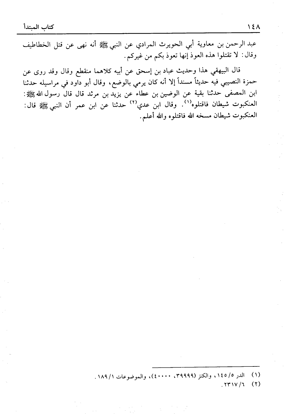 عَبْدِ الرَّحْمَنِ بْنِ مُعَاوِيَةَ أَبِي الْحُوَيْرِث الْمرَادِي عَن النَّبِي أَنَّهُ نَهَى عَنْ قَتْلِ الْخَطَاطِيفِ وَقَالَ: لَا تَقْتُلُوا هَذِهِ الْعُوَذَ إِنَّهَا تَعُوذُ بِكُمْ مِنْ غَيْرِكُمْ.