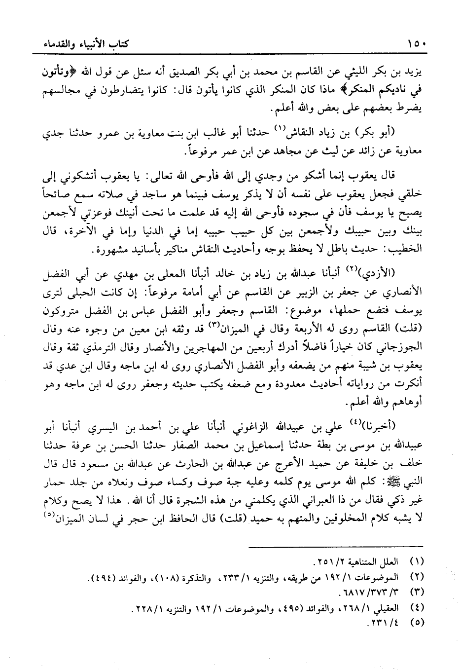 (الْأَزْدِيّ) أَنْبَأنَا عَبْد الله بْن زِيَاد بْن خَالِد أَنْبَأنَا الْمُعَلَّى بْن مهْدي عَن أَبِي الْفضل الْأنْصَارِيّ عَن جَعْفَر بْن الزبير عَن الْقَاسِم عَن أَبِي أُمَامَةَ مَرْفُوعًا: إِنْ كَانَتِ الْحُبْلَى لَتَرَى يُوسُفَ فَتَضَعُ حَمْلَهَا، مَوْضُوع: الْقَاسِم وجعفر وَأَبُو الْفضل عَبَّاس بْن الْفضل متروكون (قلت) الْقَاسِم روى لَهُ الْأَرْبَعَة وَقَالَ فِي الْمِيزَان قد وَثَّقَهُ ابْن معِين من وُجُوه عَنْهُ وَقَالَ الْجوزجَاني كَانَ خيارًا فَاضلا أدْرك أَرْبَعِينَ من الْمُهَاجِرين وَالْأَنْصَار وَقَالَ التِّرْمِذِيّ ثِقَة وَقَالَ يَعْقُوب بْن شيبَة مِنْهُم من يُضعفهُ وَأَبُو الْفضل الْأنْصَارِيّ روى لَهُ ابْن مَاجَه وَقَالَ ابْن عدي قد أنكرتُ من رواياته أَحَادِيث مَعْدُودَة وَمَعَ ضعفه يكْتب حَدِيثه وجعفر روى لَهُ ابْن مَاجَه وَهُوَ أوهاهم وَالله أعلم.